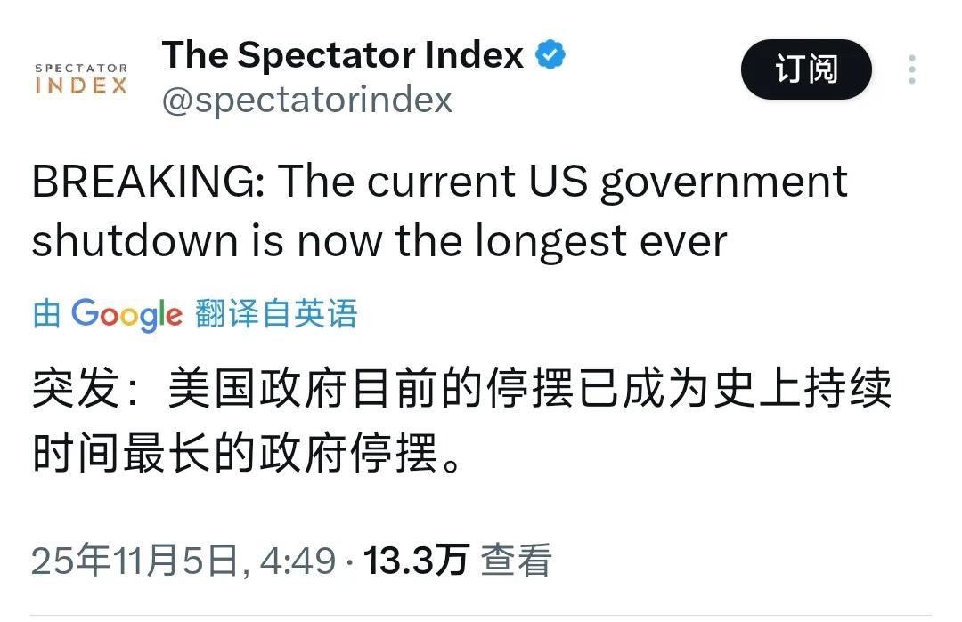 来自外媒11月4日的消息说,由于美国国会参议院再次没能通过拨款法案。所以,美国政府的关门已经追平了美国历史上最长的时间纪录。 消息强调,这一次,美国政府的停摆已经达到了35天,这追平了美国历史上的停摆记录。 事实上,上一次的停摆是在特朗普第一个任期之内出现的情况。现在特朗普在第二个任期之内,同样出现了这样长的停摆现象。 其实,对于全世界来说,看到美国这样的情况,也是感觉到非常吃惊的。毕竟一个超级大国,世界头号强国,动辄出现政府关门,这样的情况怎么能不令人感觉到吃惊? 但是目前的停摆,可以说特朗普政府有些束手无策。因为民主党和共和党的斗争已经到了非常剧烈的地步,虽然当前的民主党实力较弱。但是并不意味着他们就能够支持特朗普。他们在千方百计的制造矛盾和困难,给特朗普带来一些严重的影响,以制约特朗普的执政,这就是当前的现实。