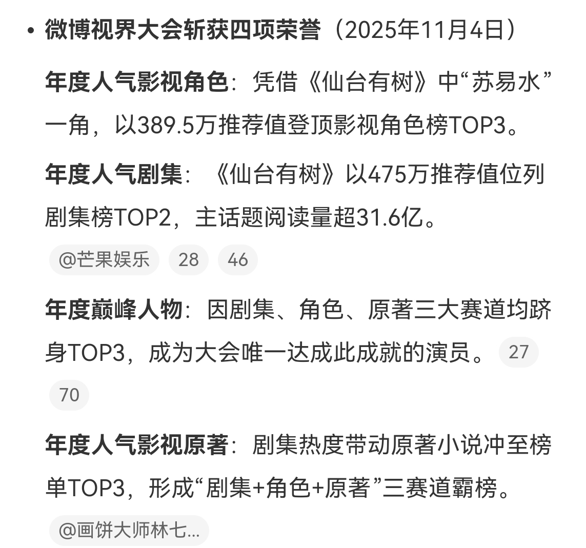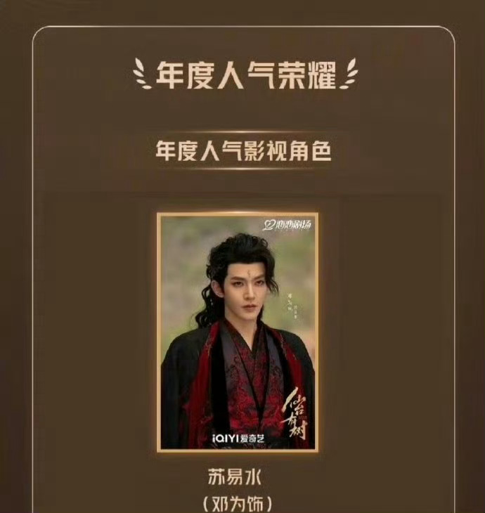 邓为的含金量还在上升,微博视界大会斩获年度巅峰人物,第一部一番男主剧《仙台有树》苏易水也拿下了三奖项!共计四个奖项收入囊中,因剧集、角色、原著三大赛道均跻身TOP3,成为大会唯一达成此成就的演员。