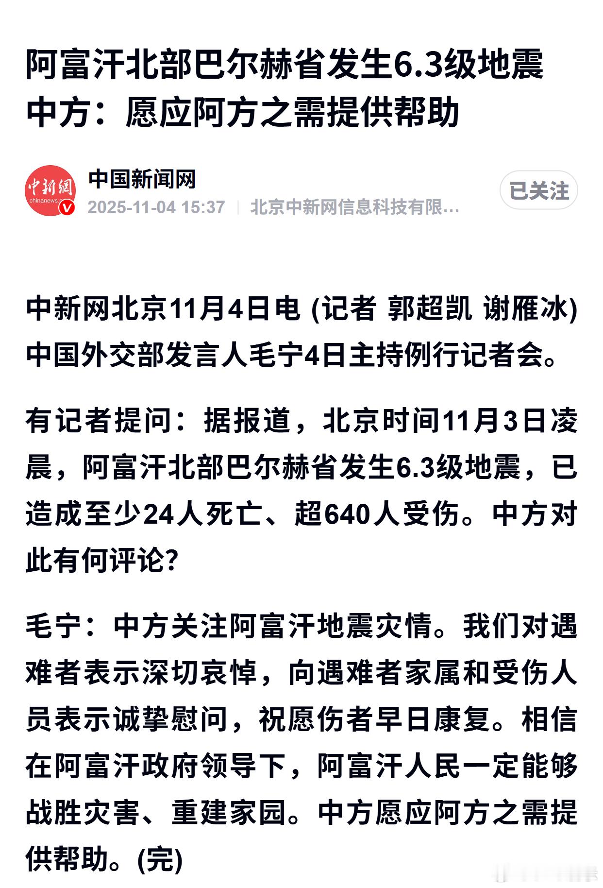 阿富汗北部巴尔赫省发生6.3级地震中方:愿应阿方之需提供帮助