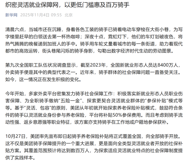 不管怎么说,美团终究算是第一个给所有骑手都安排社保的平台,无论平台初衷是竞争还是责任,这种转变对骑手来说都是好事。也只有尊重劳动者的价值,行业才能走得更稳。这种变化,比单纯的补贴优惠更有意义。