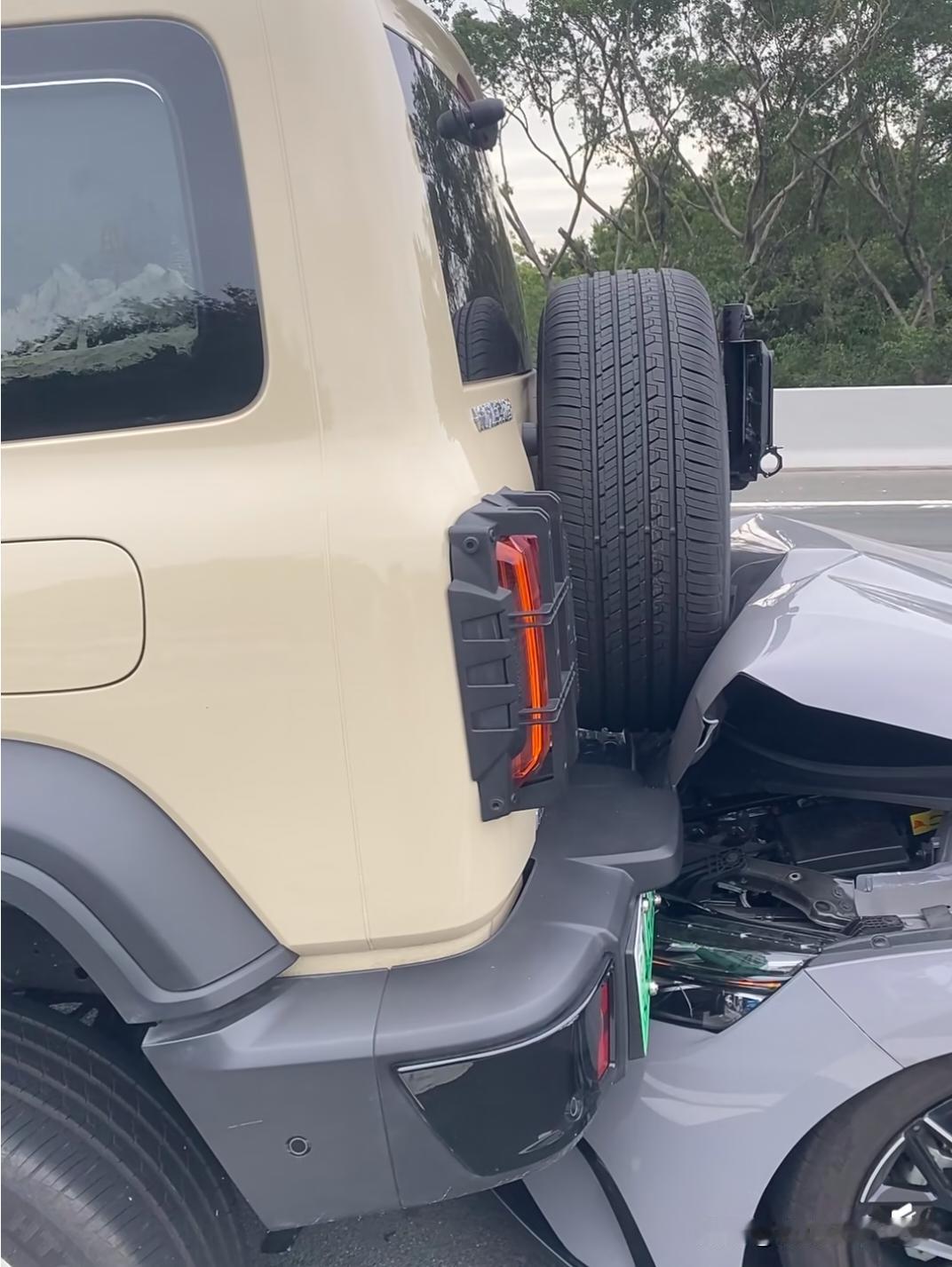 开坦克确实可以护住小命。 前车急刹,疯狂踩刹车才刹住,结果后车的兄弟没刹住撞上来
