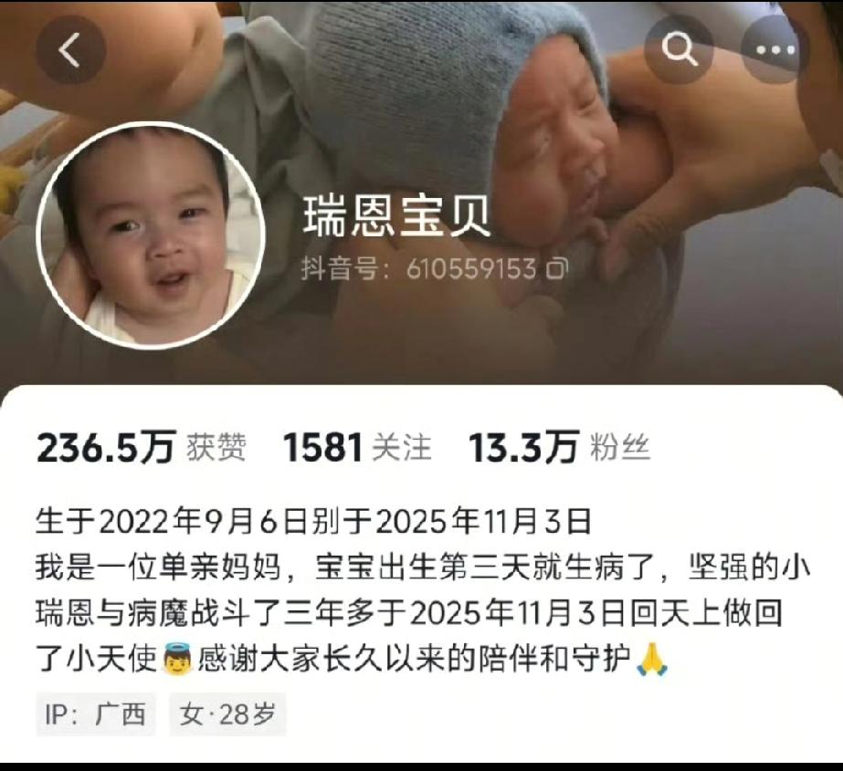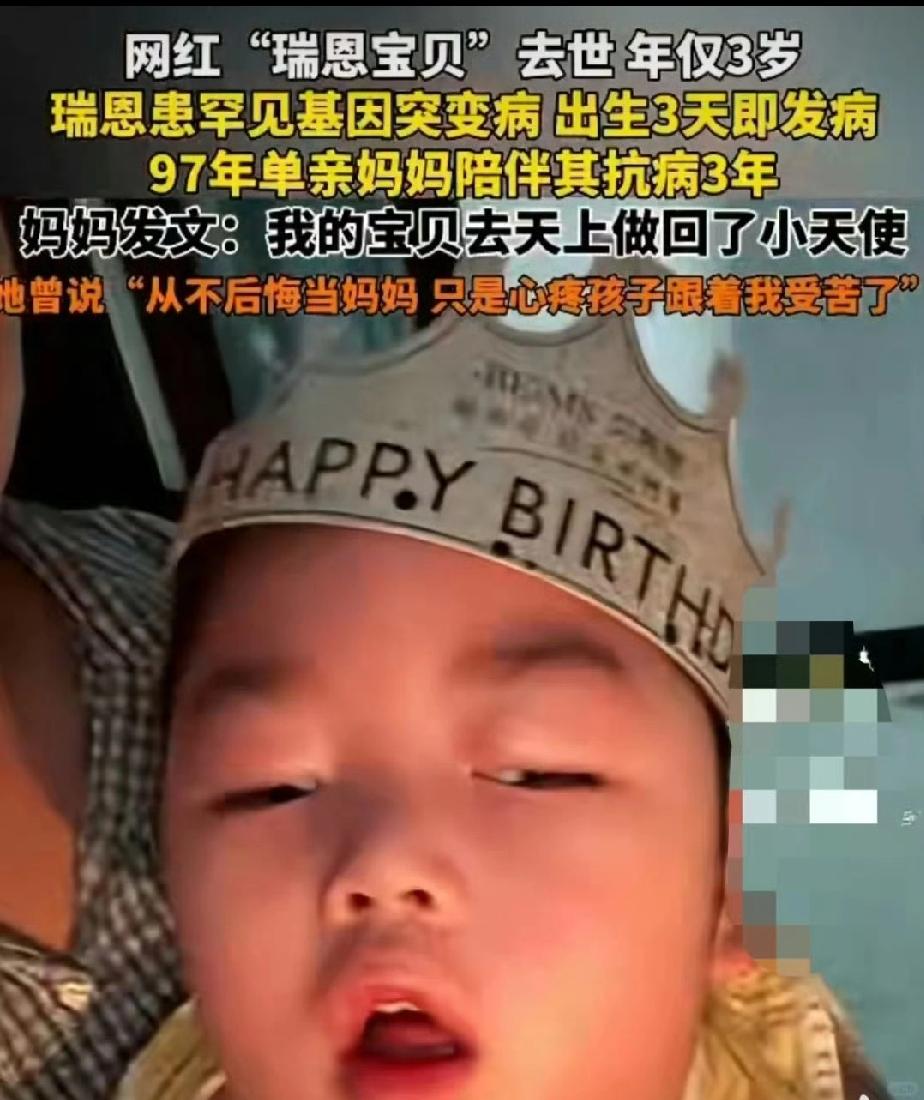 痛心!3岁网红“瑞恩宝贝”永远离开了我们 11月3日,一则令人痛心的消息传来,网红“瑞恩宝贝”永远地闭上了眼睛,年仅3岁。一个本该在父母怀里撒娇、无忧无虑玩耍的年纪,却被病魔无情地夺走了生命。 原来,瑞恩由于基因突变,出生仅3天就被确诊为婴儿癫痫,每日发作数十次。想象一下,小小的他要承受多大的痛苦,而他那年轻的97年单亲妈妈,又该经历怎样的煎熬。在长达3年的时间里,妈妈带着瑞恩与病魔顽强抗争,四处寻医问药,每一次治疗都像是在与命运拔河。 如今,瑞恩还是离开了这个世界。妈妈在社交平台发文“我的宝贝去天上做回了小天使”,短短一句话,饱含了多少不舍与悲痛。这则消息一经发出,瞬间引发了众多网友的哀悼,大家纷纷在评论区留言,表达对瑞恩的惋惜和对妈妈的安慰。 这一事件也让我们再次意识到生命的脆弱和无常。一个鲜活的小生命,就这样在病魔面前消逝了。同时,也让我们看到了母爱的伟大,这位年轻的单亲妈妈,在面对如此巨大的压力和痛苦时,始终没有放弃,一直陪伴在孩子身边。 希望瑞恩在天堂没有病痛,能像妈妈说的那样,做一个快乐的小天使。也希望社会能给予像瑞恩妈妈这样的家庭更多的关注和帮助,让他们在面对困境时能感受到温暖和力量。愿世间再无病痛,每个孩子都能健康成长。