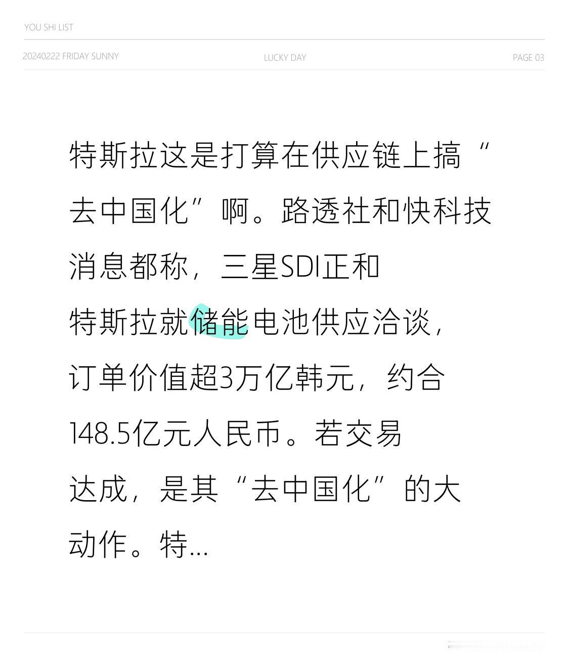 特斯拉这是打算在供应链上搞“去中国化”啊。路透社和快科技消息都称,三星SDI正和特斯拉就储能电池供应洽谈,订单价值超3万亿韩元,约合148.5亿元人民币。若交易达成,是其“去中国化”的大动作。 特斯拉首席财务官说美国关税影响能源业务,所以找中国外的供应商。目前其储能电池100%来自宁德时代等中国企业。而且储能业务是核心,三季度营收34.2亿美元,同比增44%。近几个月,它还和三星电子、LG新能源签了协议。不过,它电动车供应链短期内估计也难大规模“去中国化”。