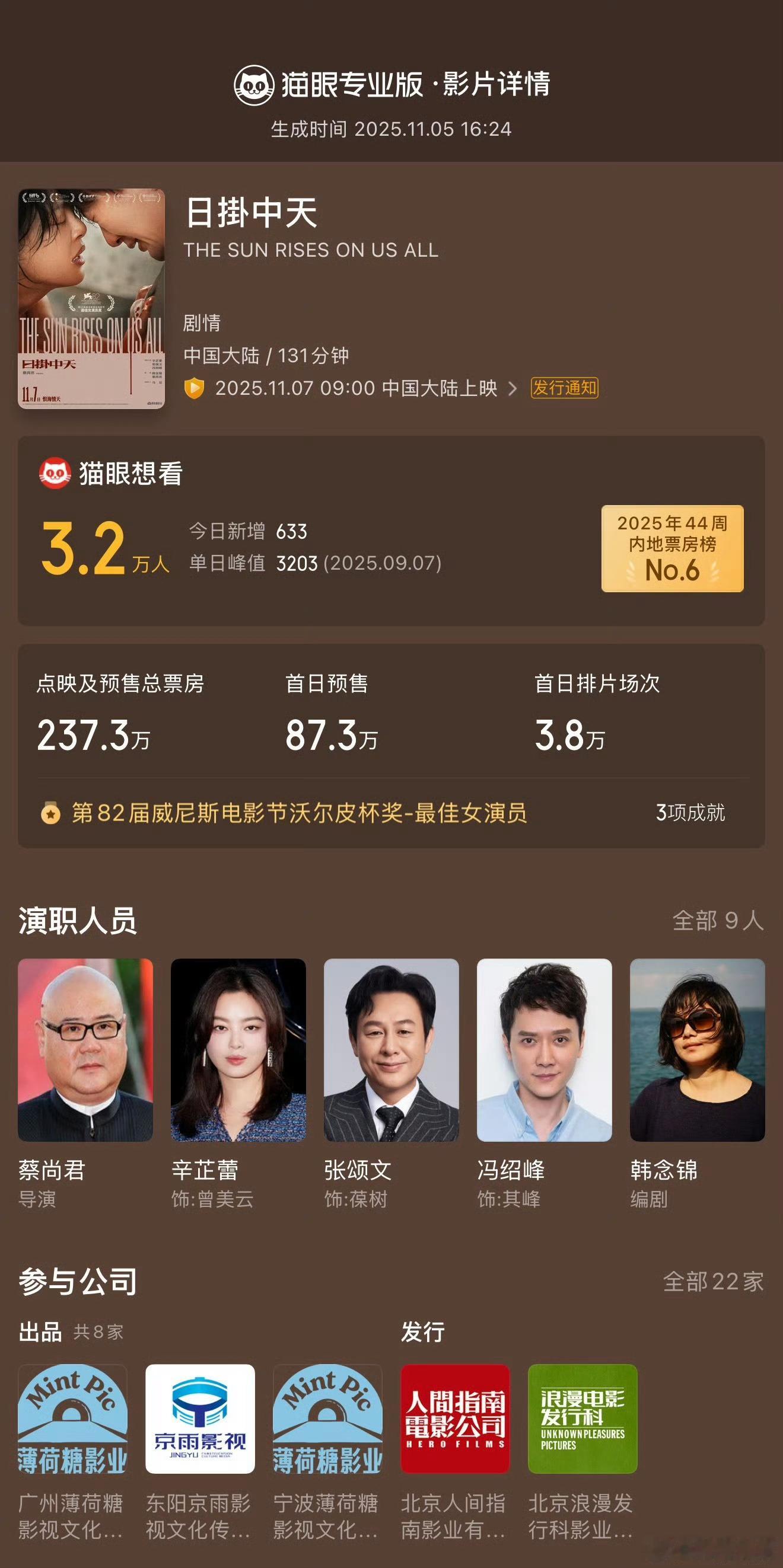 杨幂连包10场支持辛芷蕾新片 据猫眼专业版云包场显示, 连包10场支持辛芷蕾新片《日掛中天》,影片将于11月7日正式上映,截至当前点映及预售总票房已超237.3万。杨幂包场支持日掛中天