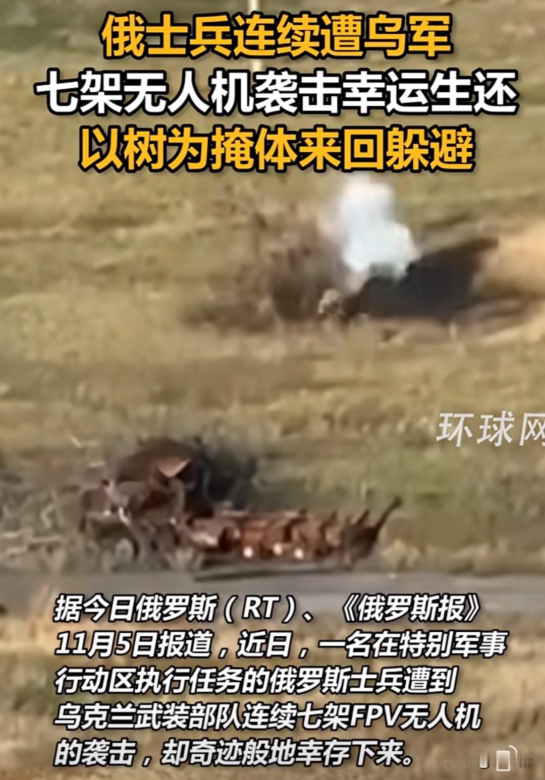 就在刚刚 7架无人机轮番轰炸,俄士兵战场死里逃生 11月5日 第1194摩托化步兵团一名士兵 在乌克兰战场遭遇七架无人机连续攻击 最终活了下来 视频里 士兵一直在跑 不停躲无人机 他冲到一棵大树后 无人机接二连三在旁边炸开来 第三架无人机像是直接撞在他身上 他倒在地上 又慢慢爬起来 接着往前冲 现在战场里 无人机最危险 乌克兰要在2026年造800万架无人机 拿来侦察和攻击 90%都要做FPV无人机 这种无人机不贵 容易造 两边都在用 士兵遇到无人机 办法挺多 有人用头盔砸无人机 让炸药提前爆 有人用枪托打下来 还有人把无人机扔的手榴弹捡起来扔回去 都是没办法的应急反应 俄军一直在升级反无人机的办法 把老的防空武器拿来用 还加强电子战 干扰无人机的控制信号 无人机攻击越来越密集 俄罗斯9月曾一次向乌克兰发射805架无人机 是单次袭击最多的一次 俄军还打乌克兰的能源设施 这是冬季战略的一部分 战场从来不是数字和装备的堆砌 是一个个活生生的人在硬扛 每一次躲过攻击 每一次应急反应 都是想活着回去 无人机让战场变了样 但活着的本能 从来没变过