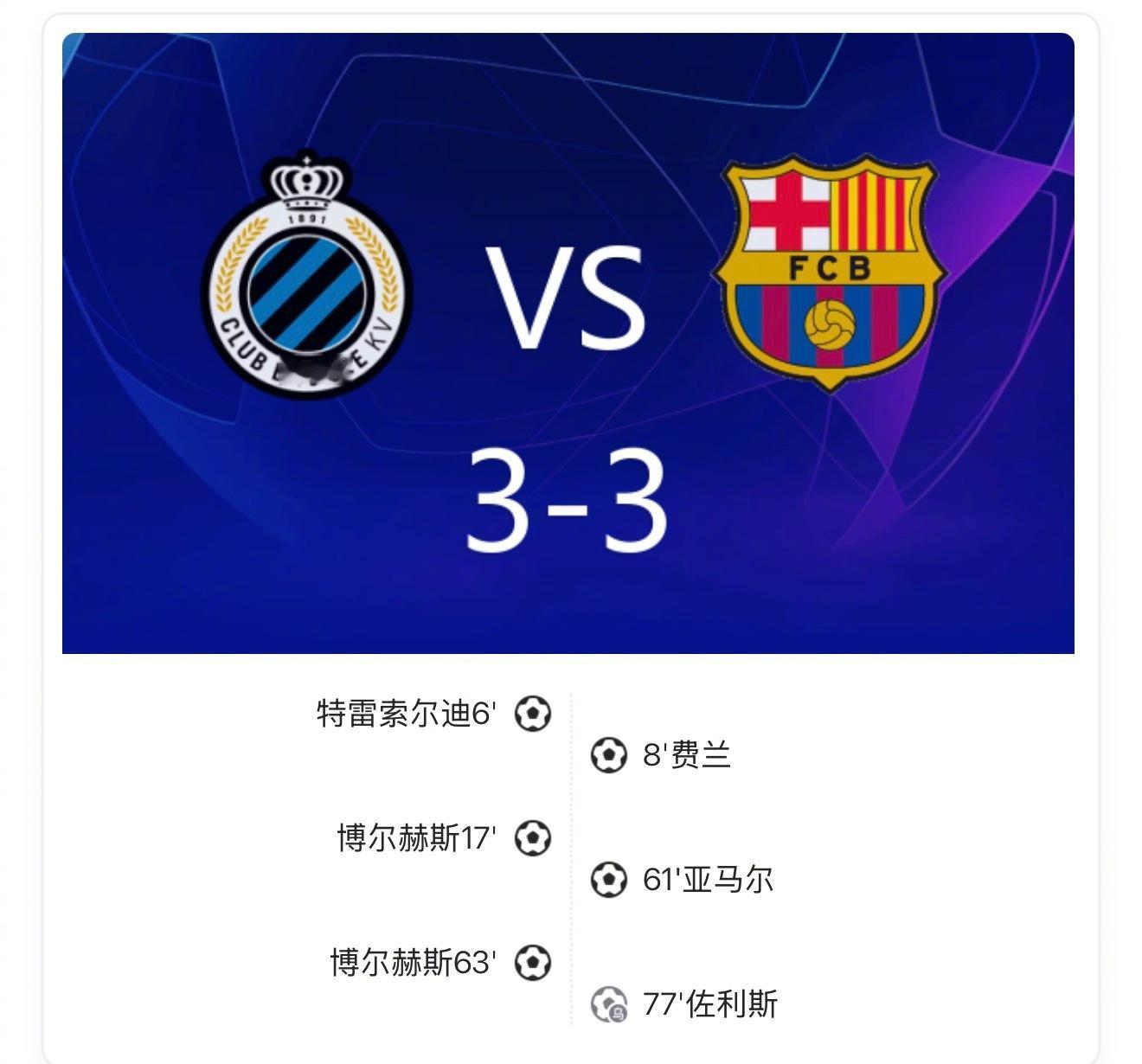 【欧冠:布鲁日3-3巴萨,福布斯2射1传,亚马尔破门】上半场特雷索尔迪破门首开纪录,随后费兰破门扳平比分,福布斯破门再度帮助布鲁日将比分超出。下半场亚马尔破门扳平,随后福布斯单刀破门再度领先,亚马尔传球造成佐利斯自摆乌龙。