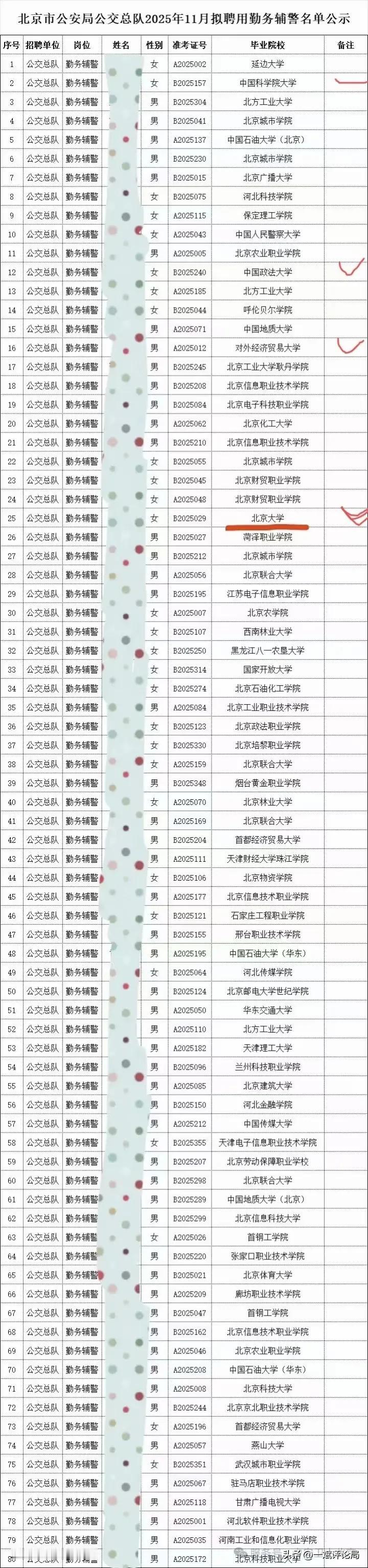 2025年10月31日,北京市公安局公交总队发布招聘80名勤务辅警公示名单,竟然出现了1名北京大学毕业的女生,还有两名女生分别来自中国科学院大学、中国政法大学。另外还有对外经济贸易大学、中国石油大学等985高校毕业生。 众多学子和家长们青睐的著名高校和985高校,其最终归宿却是学历要求并不高的辅警。这说明了什么?!
