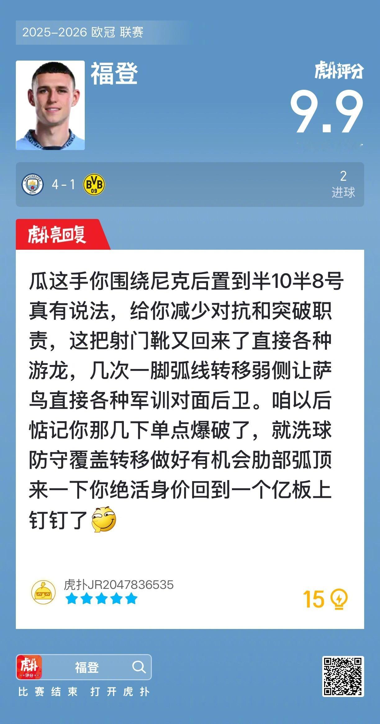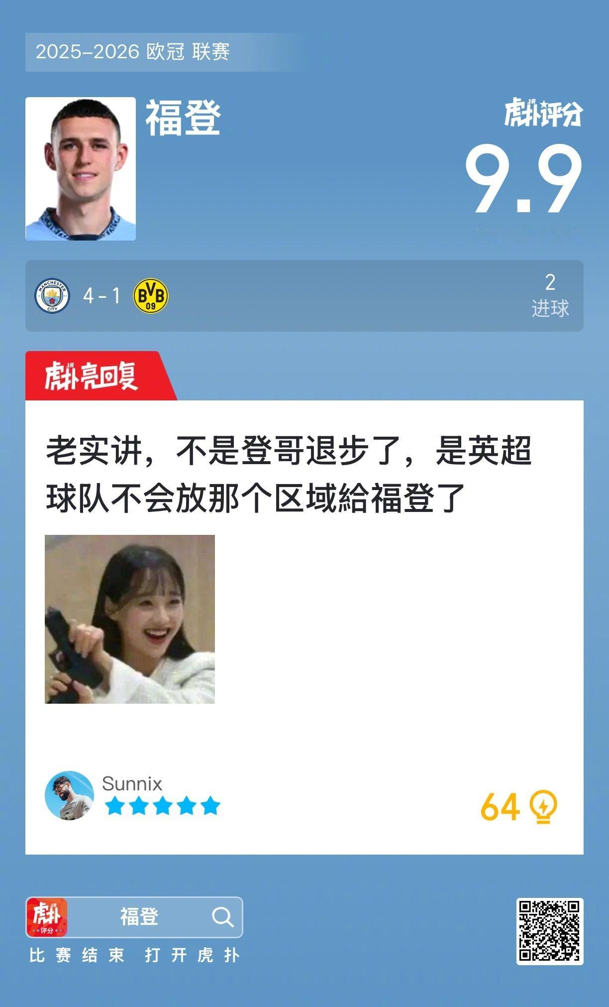 曼城4比1多特蒙德福登打进两球,赛后收获9.9的虎扑评分!