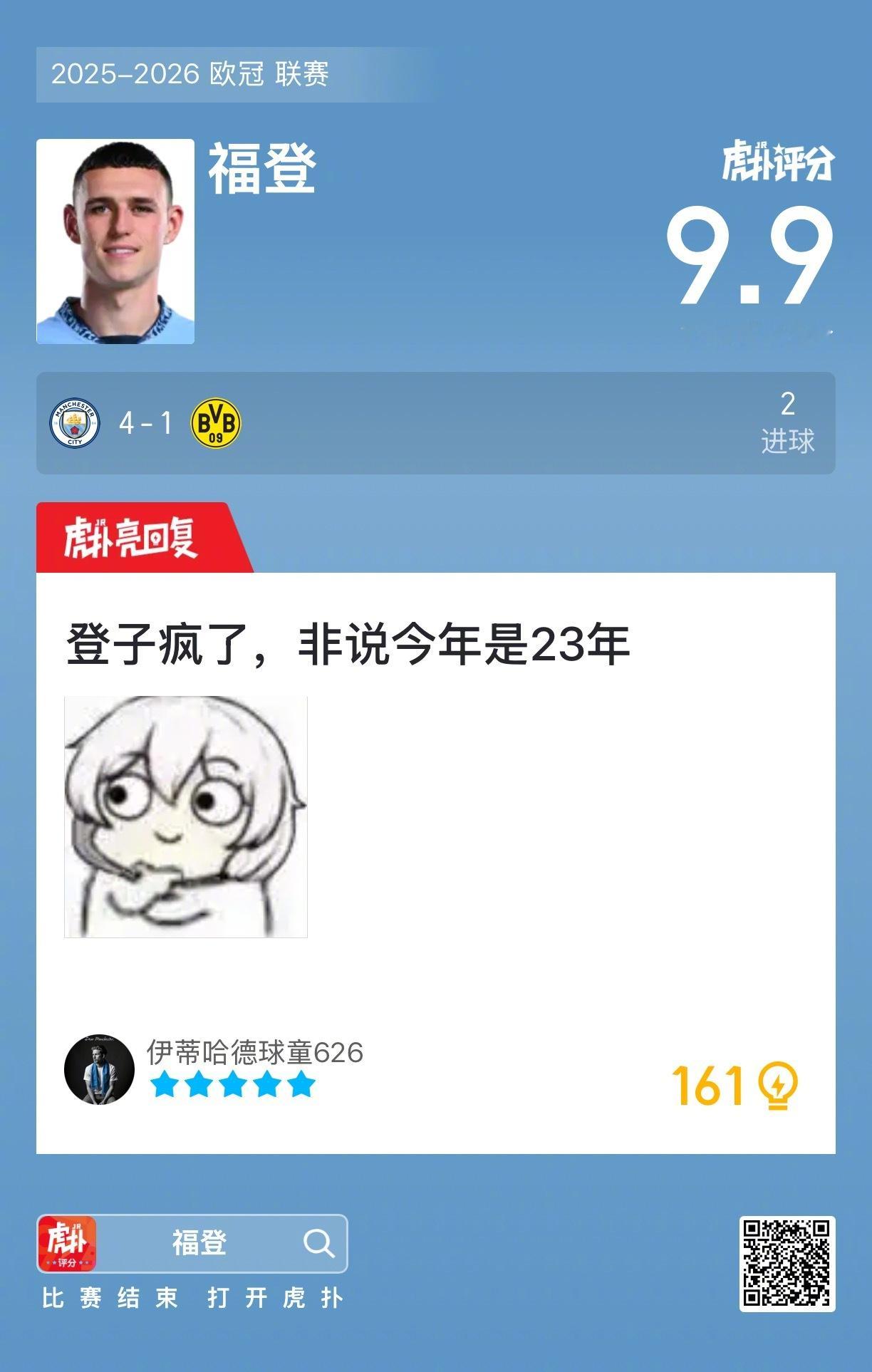 曼城4比1多特蒙德 福登打进两球,赛后收获9.9的虎扑评分!