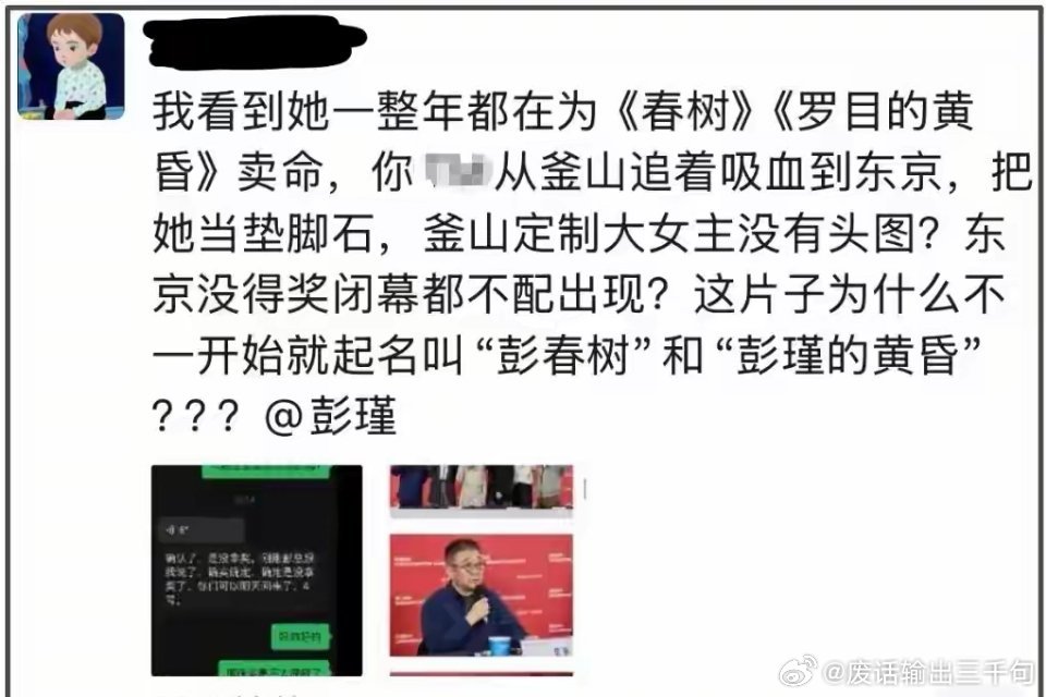 一位名为“圈少说”的百万粉丝大V放出疑似白百何好友朋友圈截图,令人意外的是,对方没有点名王传君,更没有提及争奖风波另一位主角文晏,而是直接炮轰《春树》制片人彭瑾,指责对方追着白百何“吸血”。