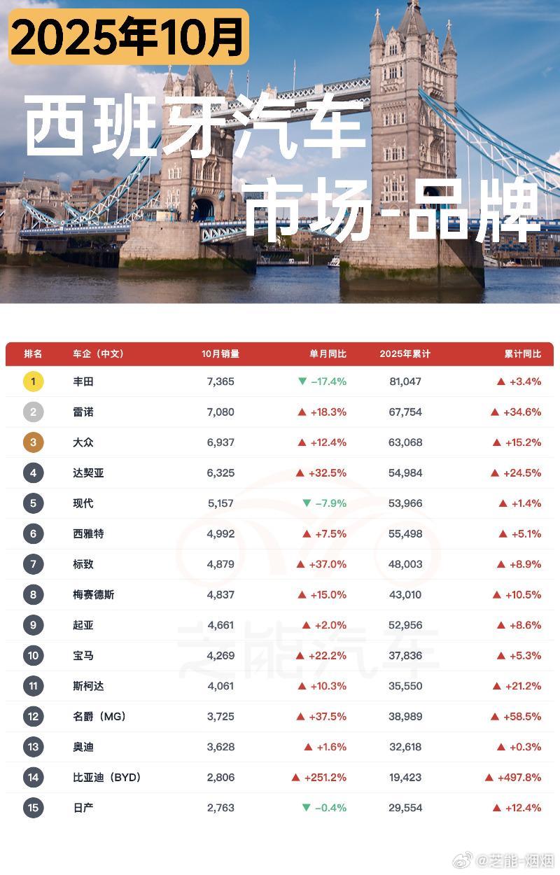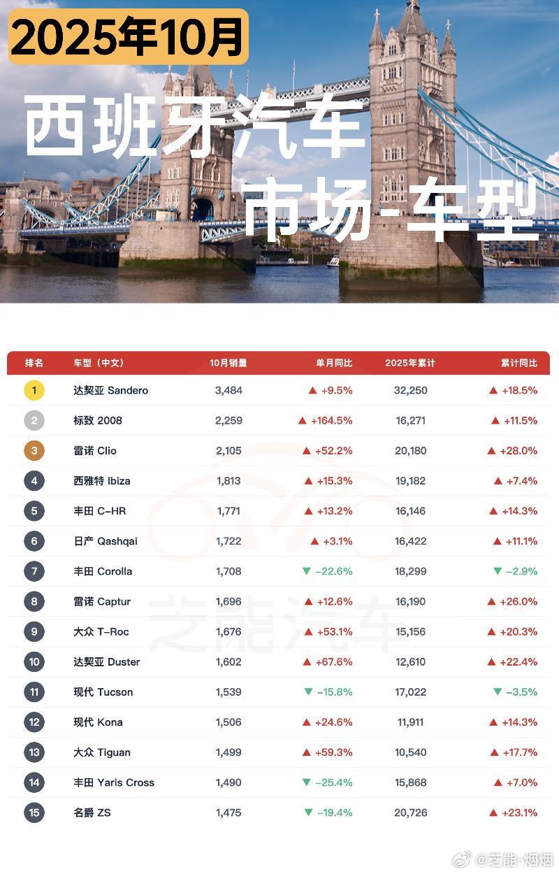 2025 年 10 月西班牙车市延续增长,销量同比涨近 16%,快恢复到疫情前水平,新能源渗透率更是创下 22.4% 的新高。