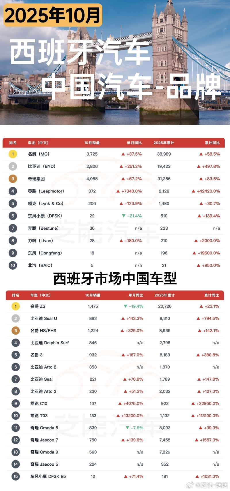 传统品牌仍占主导,但中国品牌势头很猛,总销量超 1 万辆,占比约 10.3%。比亚迪、零跑等增幅惊人,奇瑞体系通过本地组装的 Ebro 品牌跻身前二十,名爵也稳步增长,在新能源赛道上逐渐站稳脚跟。