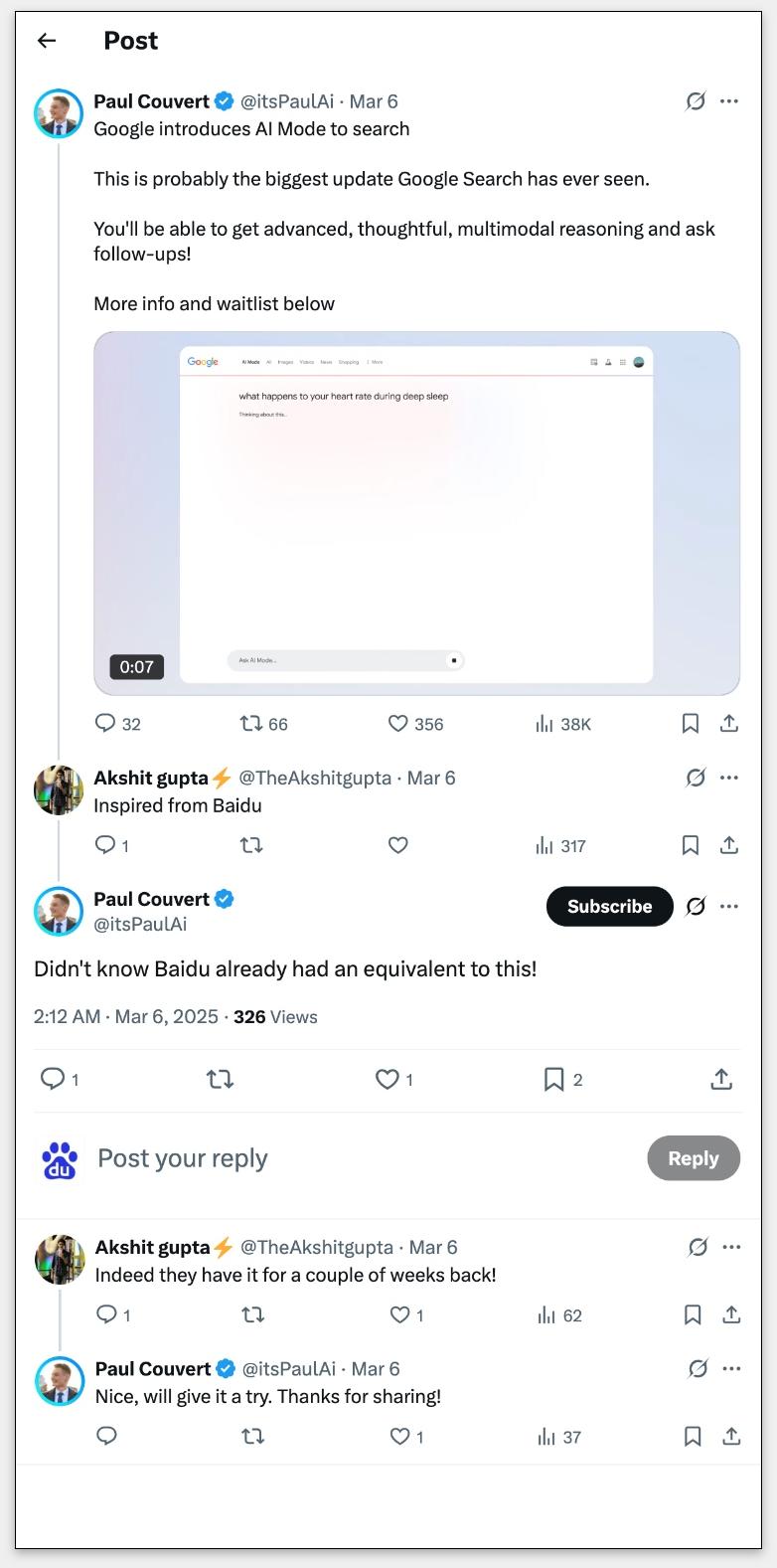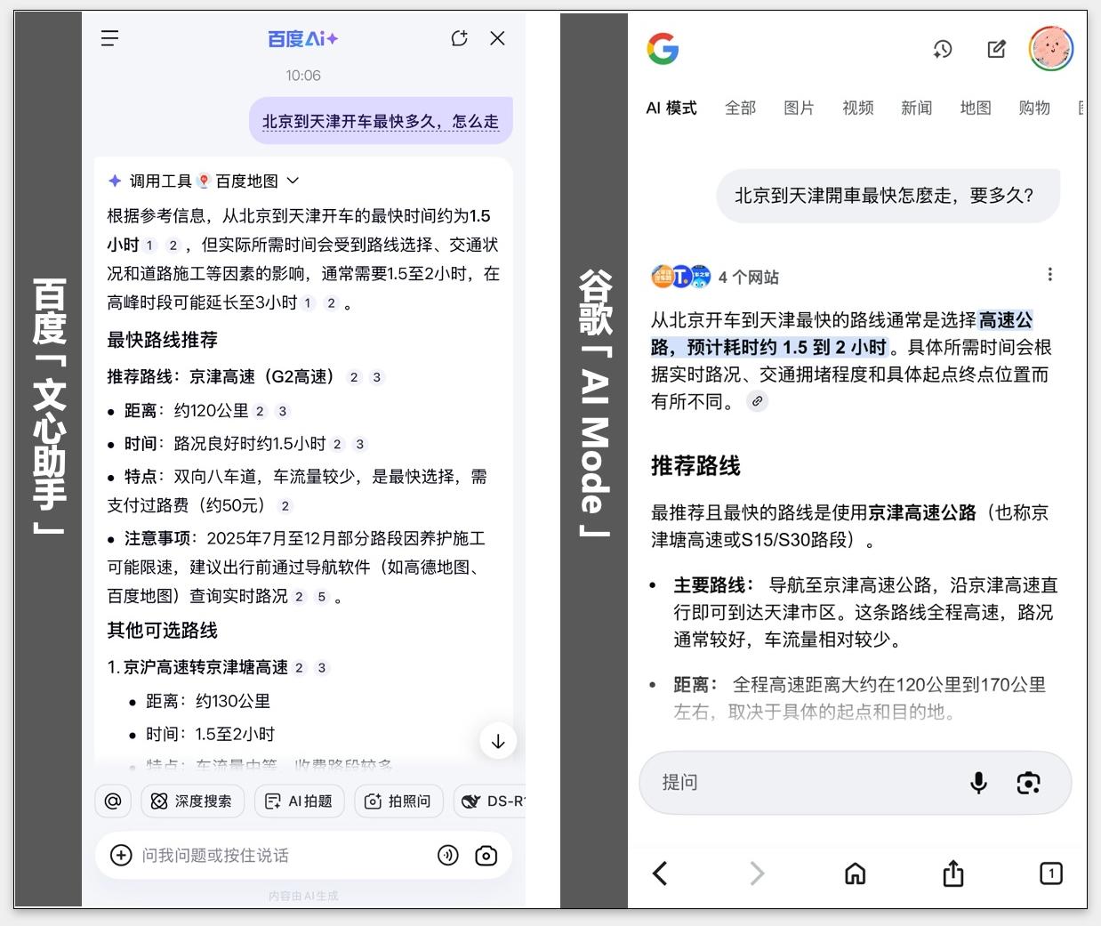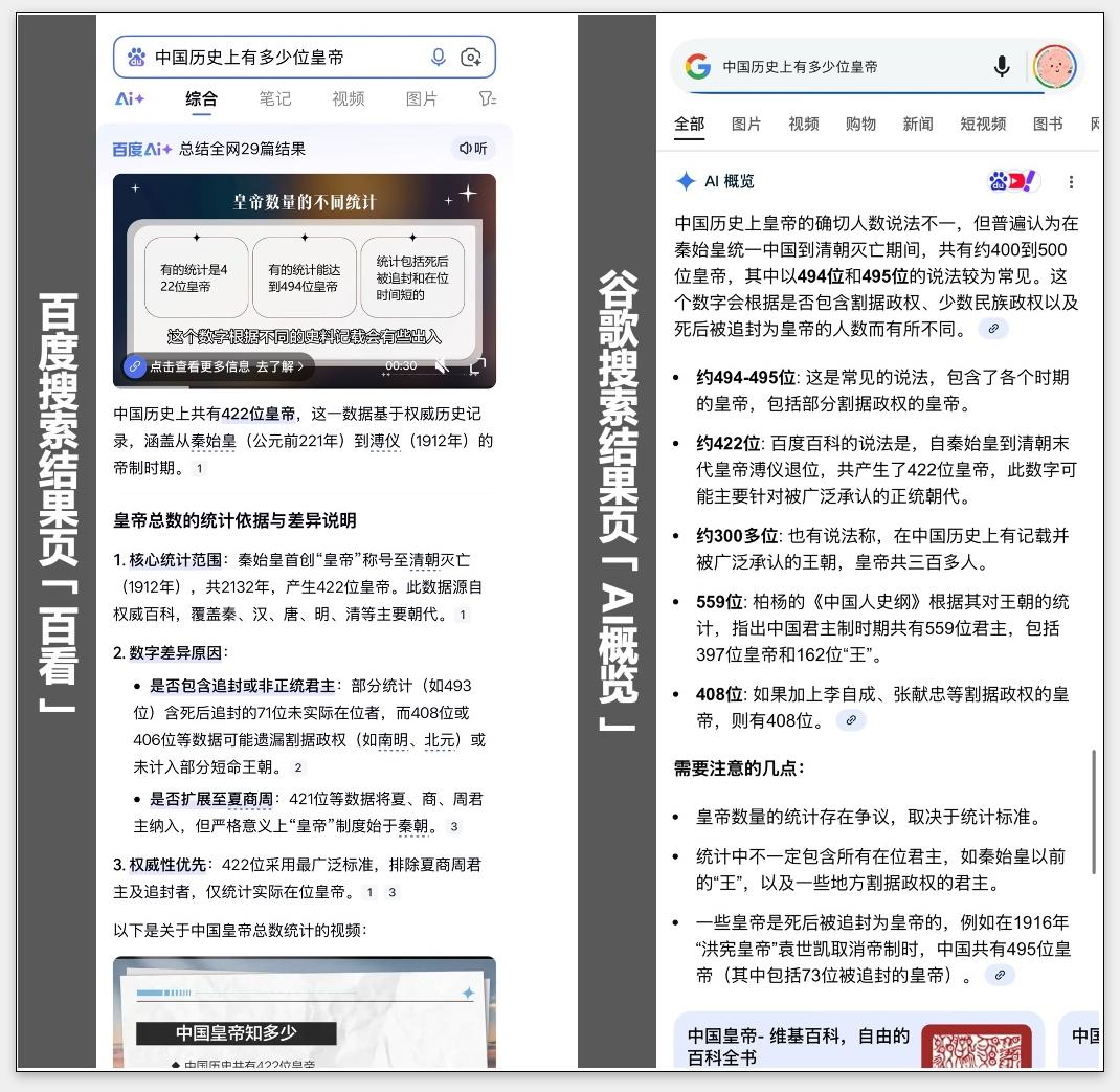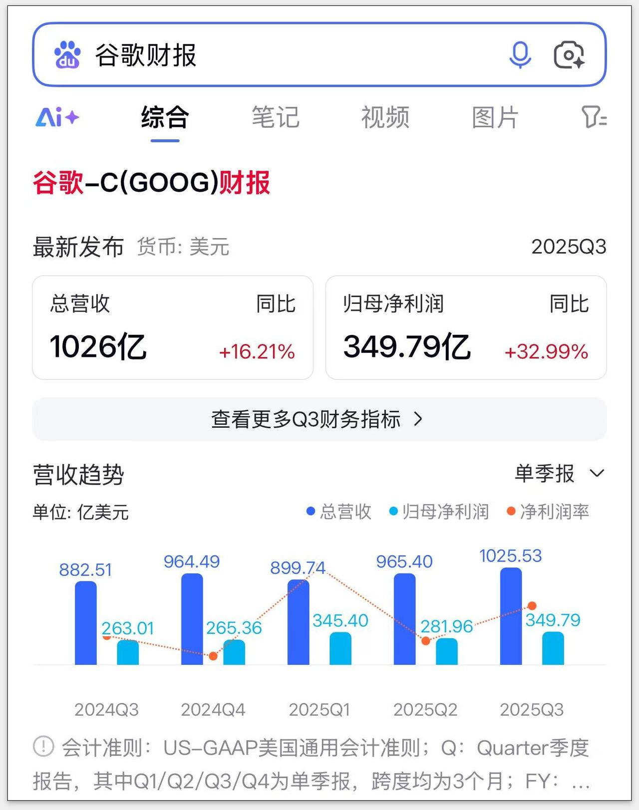 谷歌AI搜索复兴,能映射出百度成长空间吗? 谷歌今早收盘涨超2%创新高,Q3财报破千亿美元,用一份成绩单重新证明老兵的力量。 最让人意外的是搜索,高基数下,反而越跑越快。AI Overview 和 AI Mode 带动了搜索量,也让广告展示重新热起来,AI成了谷歌搜索的新引擎。 现在,人们开始用对话提问,AI自动汇总信息、生成结论,还能理解语气、上下文和意图。 搜索变成了一个「帮你思考的系统」。 谷歌搜索负责人 Robbie Stein 在采访中说过一句话:AI没有取代搜索,它要让搜索更像人。这句话很重要;背后是谷歌在文化与产品上的一次再造。 AI让机器学会了理解语言、图像、情绪,甚至是人的好奇;所以,回头看,谷歌并没有创造新平台,反而用AI,重写了旧世界的入口。 看完谷歌这波AI重构,我第一反应百度也在干这事。 十年投了1800亿搞研发,这两年百度搜索变化确实不小,很多地方,已经能看到它自己的AI节奏。 今年7月,完成了十年来最大的一次改版,陪伴无数人青春的搜索框,被换成了一个AI智能框,它能一次读懂千字文档,也能听语音、识图片,甚至能和人多轮对话。 AI重构后的搜索结果页,让搜索结果从文字变成富媒体信息流。 搜一部剧,会出现评分、短视频、图文推荐;搜一间咖啡店,会直接生成位置、口碑、路线,搜索从「展示答案」,变成了「直接完成任务」。 当然,更深变化在底层。 文心4.5模型和视频生成模型「百度蒸汽机」成了新的底座;文心助手接入了一万八千多个MCP服务,搜索开始具备调度、生成、创作的能力。 当用户说「帮我写一份年终总结」或「生成一支宣传视频」,百度搜索能调度模型、调用工具、自动执行;那一刻,你会发现它更像一台「在思考的机器」。 智远注意到,10月15日百度搜索媒体沟通会上,它又往前走了一步,重点是强化AIGC创作能力,搜索变成了能写、能画、能拍的创造力的AI系统。 从谷歌到百度,国内外头部AI搜索走的路越来越像。 谷歌靠 AI Overview、AI Mode 优化体验,百度用智能框、百看和文心助手边改结构、边提升体验;也有国内外网友发现,百度在产品形态上这步探索,可能比谷歌还要早,它的AI搜索比谷歌AI Mode还先上线。 所以,它们都在做一件事: 让机器更懂人,让搜索重新连接世界;搜索这棵树的根已经动了,谷歌靠AI实现了历史性增长,那百度呢?也应该不远了吧。
