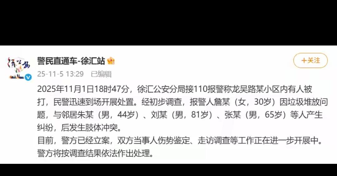 提醒别乱堆垃圾竟遭围殴?上海这起邻里冲突,绝不能和稀泥! 好心提醒邻居别把垃圾堆在自家门口,换来的却是一家三口围殴?上海这起邻里纠纷,简直刷新了对“蛮不讲理”的认知!更气人的是,老人先动手还倒打一耙,儿子直接把人拽到监控盲区掐脖殴打,这哪是邻里矛盾,分明是蓄意伤人! 楼道是公共区域,乱堆垃圾本就违反消防法和民法典,侵犯他人权益。受害者只是正当维权,却被打得要送医,事后只能被迫退租,施暴者反而倒打一耙,这种恶行绝不能纵容!年龄不是施暴的挡箭牌,“尊老”也不是“倚老卖老”的借口,法律该给正当维权者撑腰。 警方已经立案,期待查明真相,让施暴者付出代价!你遇到过类似的霸道邻居吗?该怎么对付这种蛮不讲理的人?来评论区聊聊!