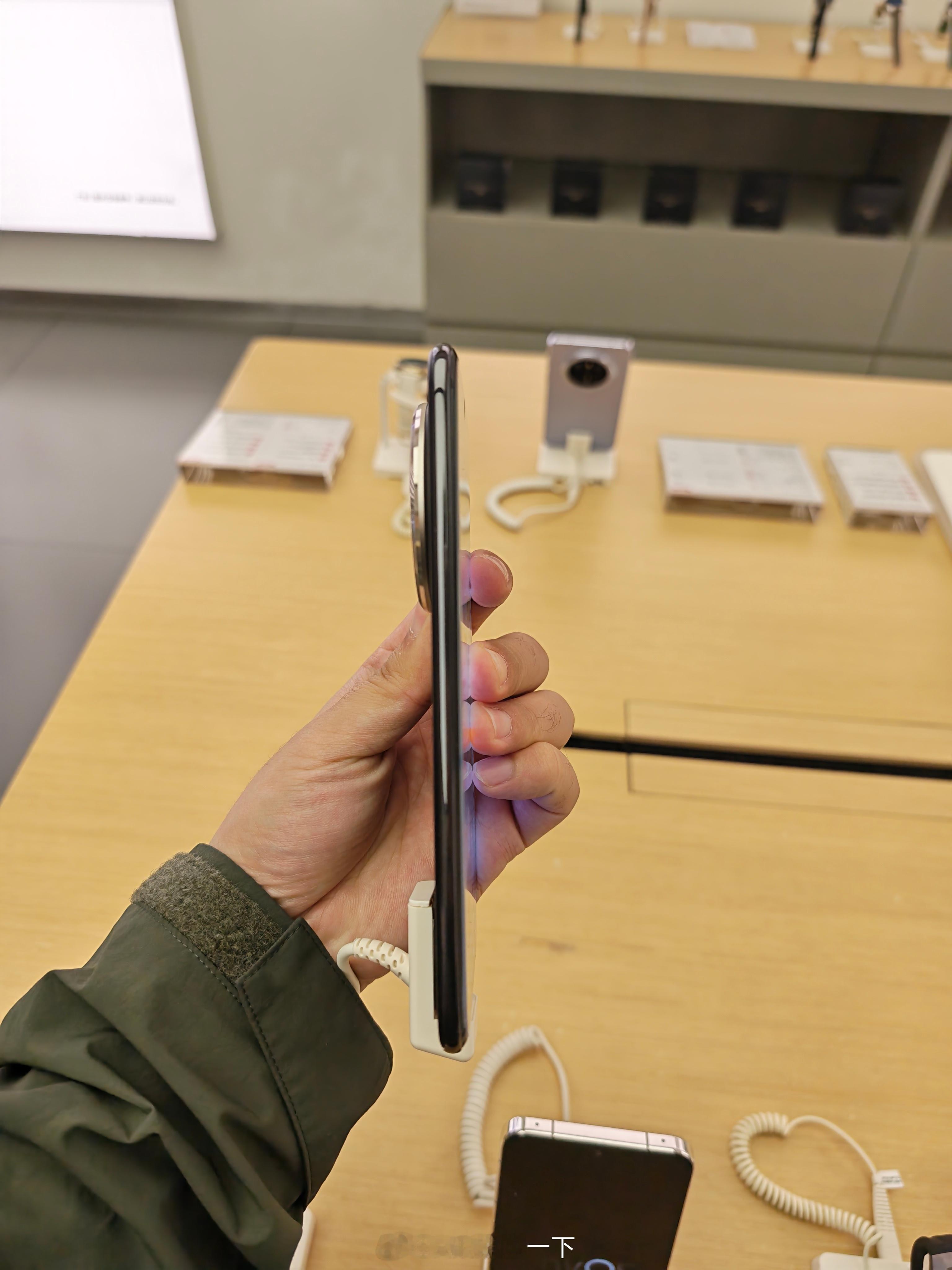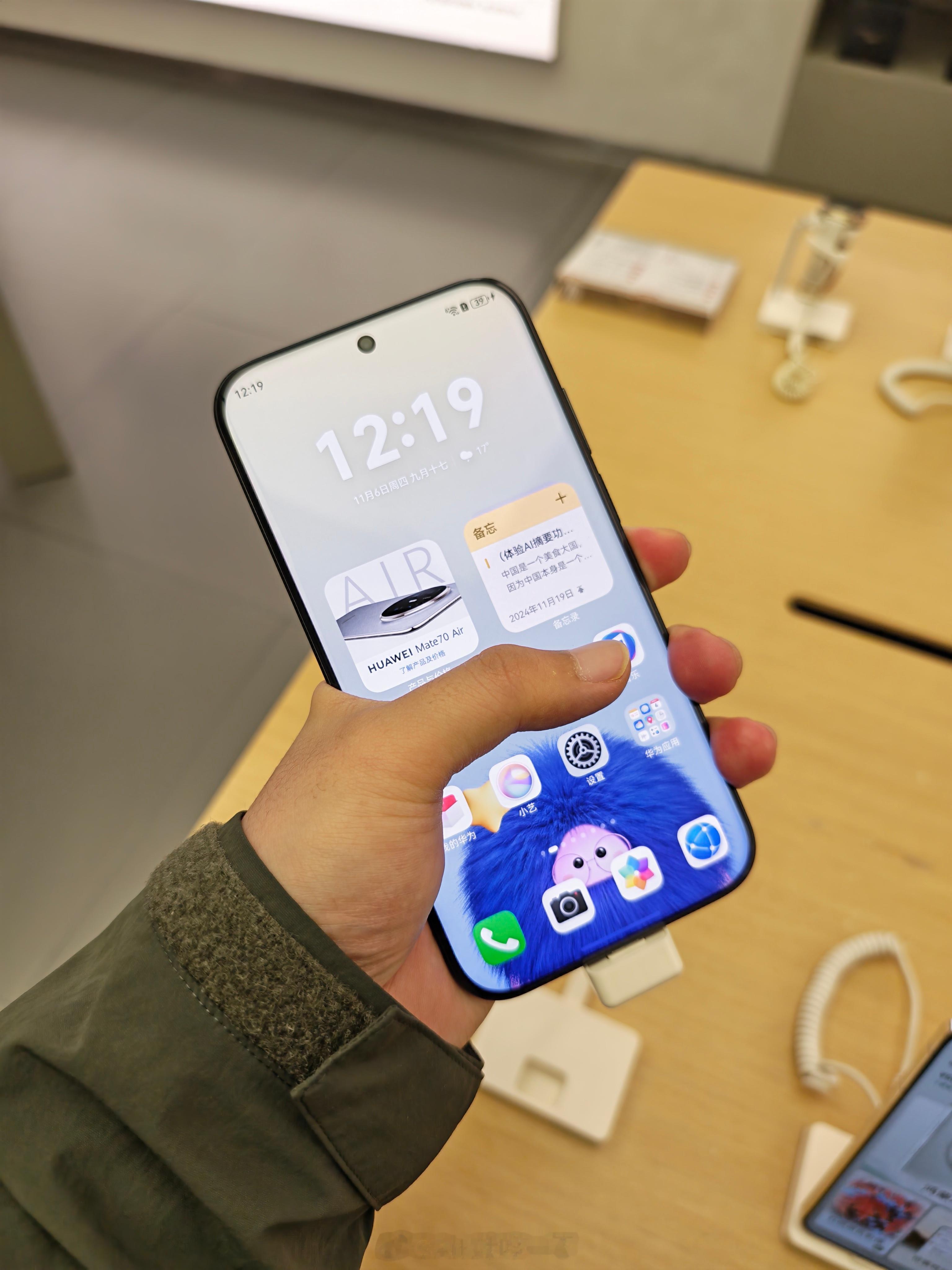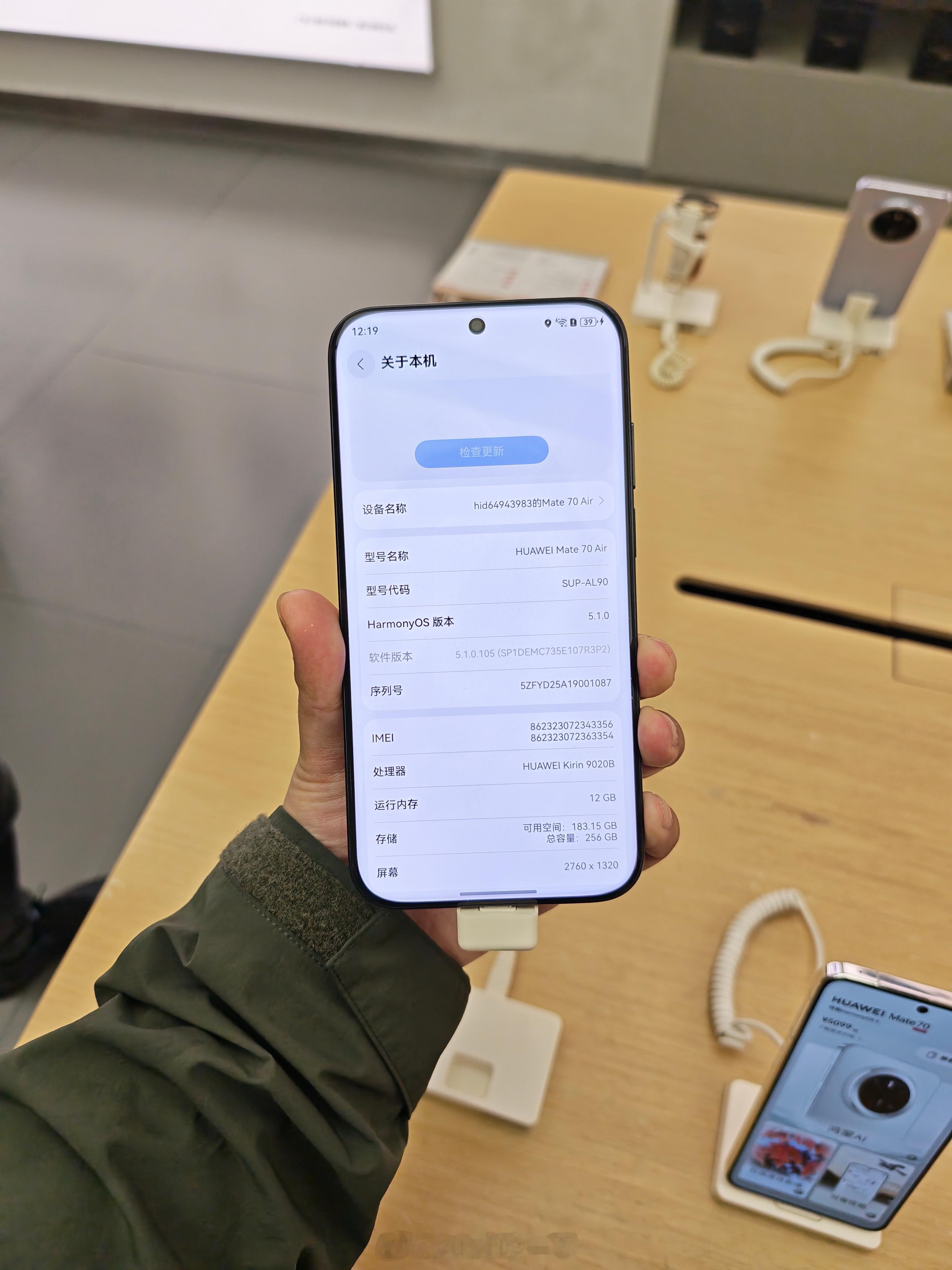 中午去看了看华为Mate70 Air,目前开卖的都是麒麟9020B版本,没有潜望长焦,新品驾到 机子确实很薄,也就正常折叠屏展开的厚度,也确实很宽,一只手捉不住,黑的很像当年的Mate50,4199的价格在华系产品中算比较便宜的了。有点东西