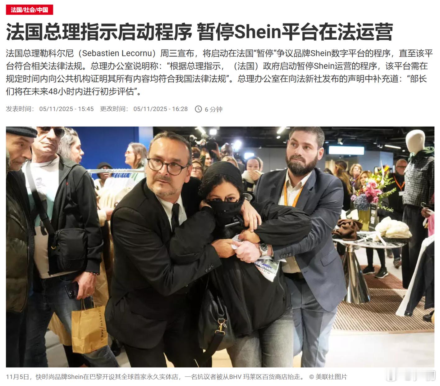 美联社:法国总理指示启动程序,暂停Shein平台在法运营。