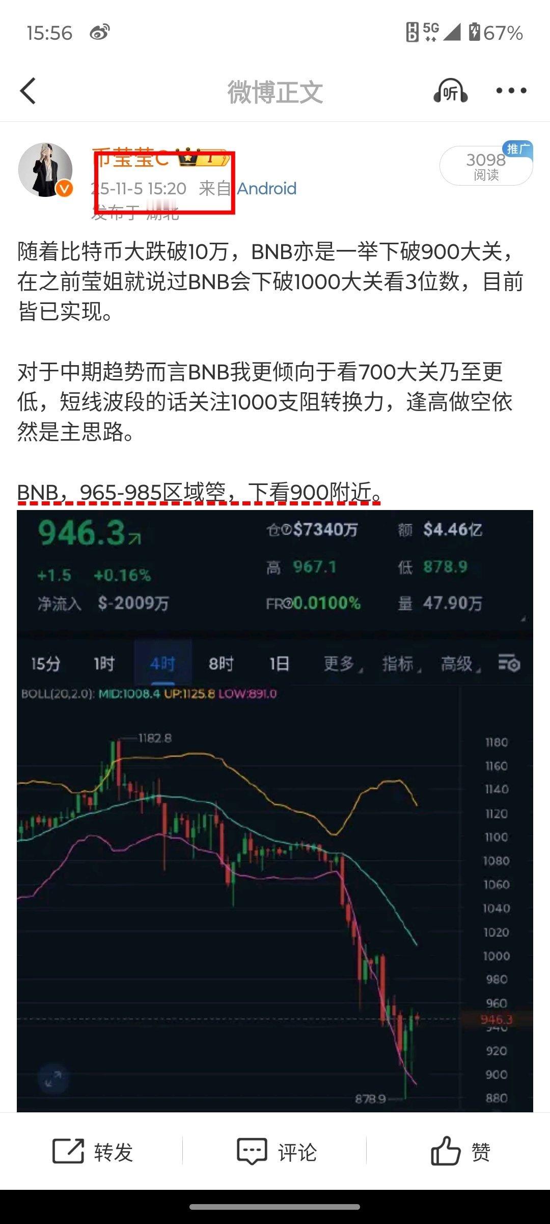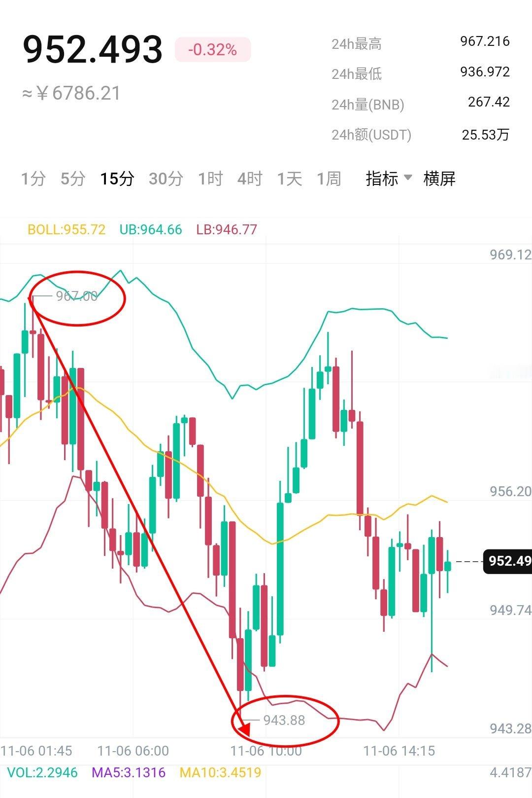 比特币冲高回落,BNB亦是承压回落,目前整体依旧处于弱势调整,重点关注1000大关压制