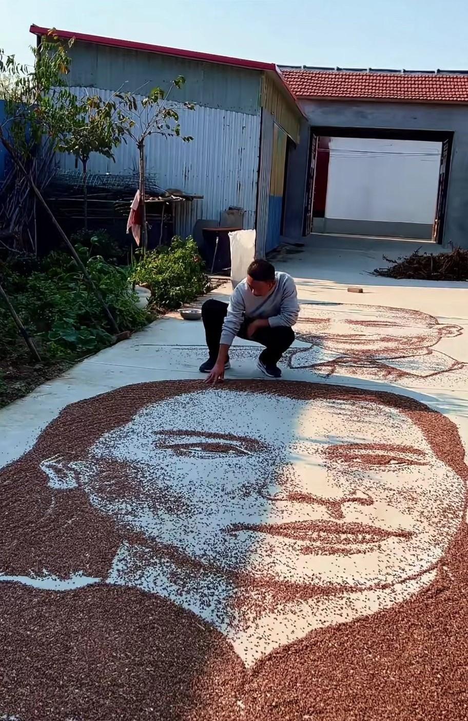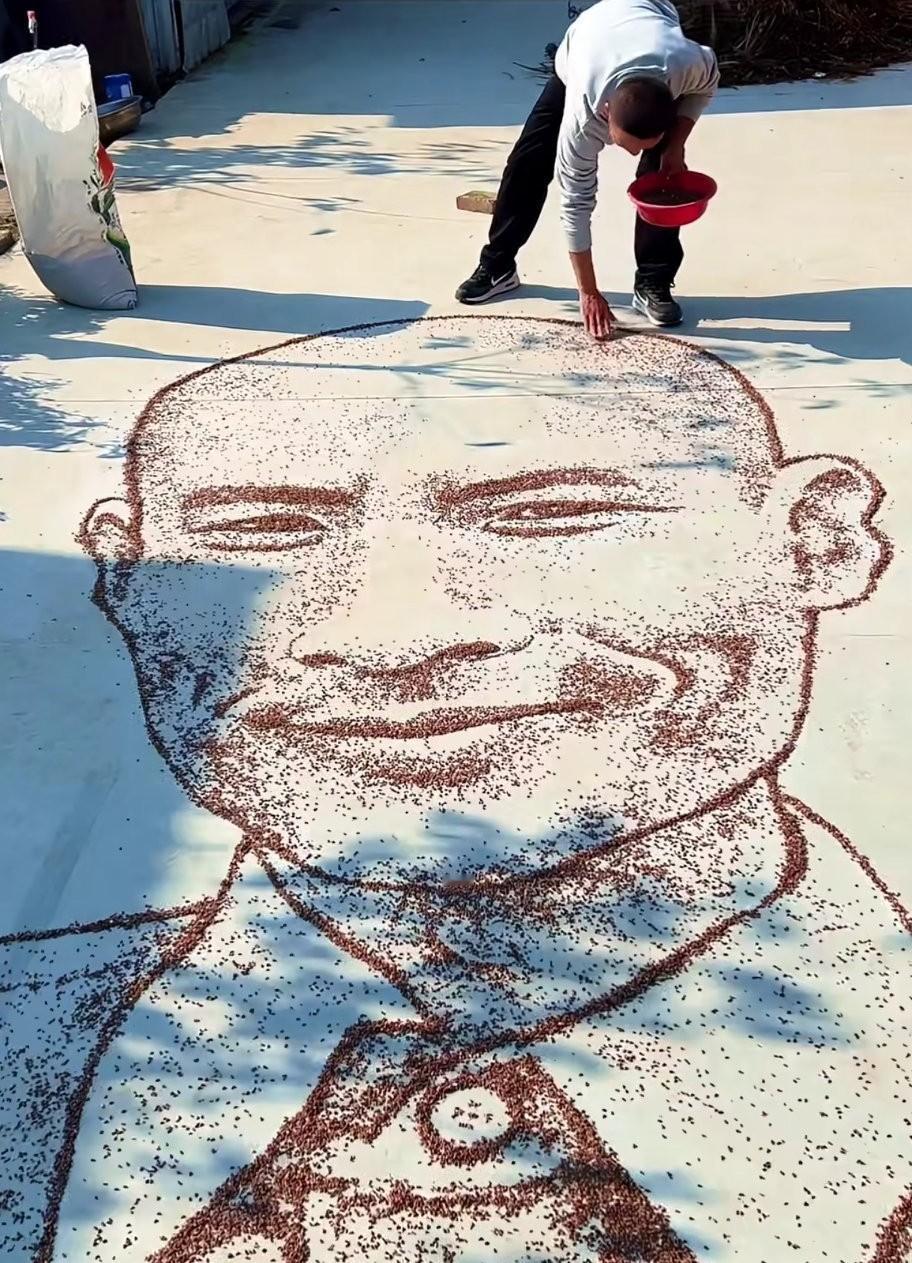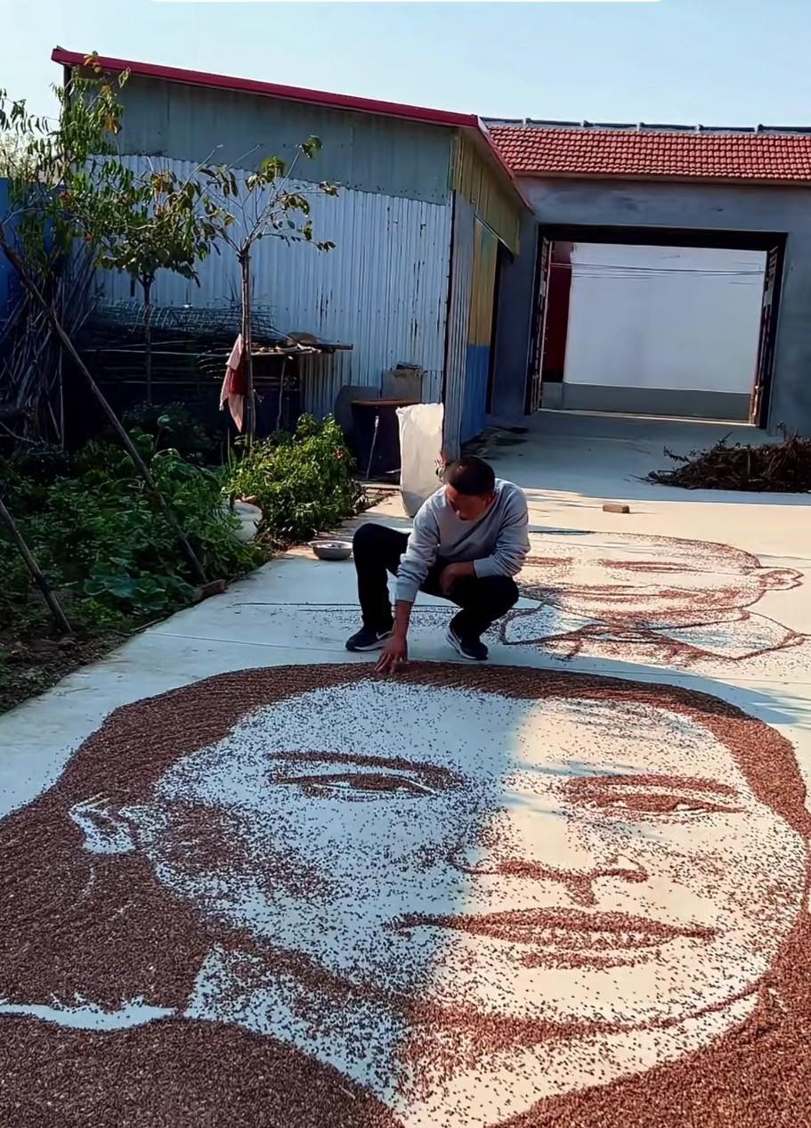 用谷物绘成的英雄组譜,是大地对烈士的敬仰! 山东滨州小伙赵同恺太牛了!他用黑小麦、玉米粒和玉米芯这些谷物,在家中庭院创作出电视剧《沉默的荣耀》中吴石、陈宝仓、朱枫、聂曦四位烈士的肖像。11月3日那天,他早上6点就开工,先用粉笔勾勒轮廓,再用约100斤自家收获的黑小麦“作画”,花了8小时完成长宽数米的巨幅作品。地面视角受限,他就把手机绑在4米高竹竿上检查修改。作品里烈士神态栩栩如生,获超75万网友点赞。谷物本是人类驯化万年的主角,他却用谷物绘出英雄组谱,致敬英雄,太令人敬佩!