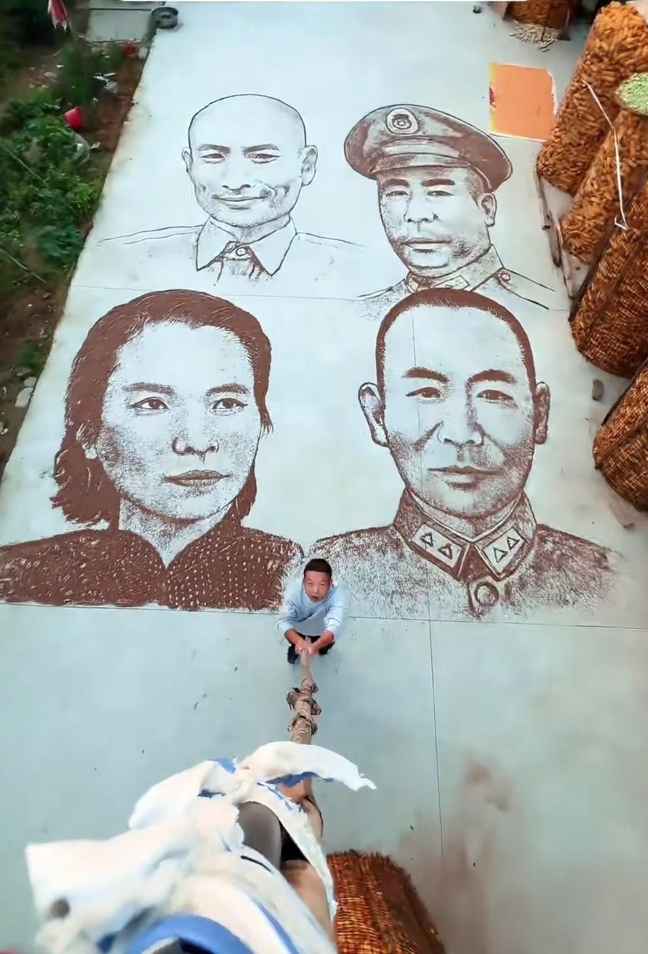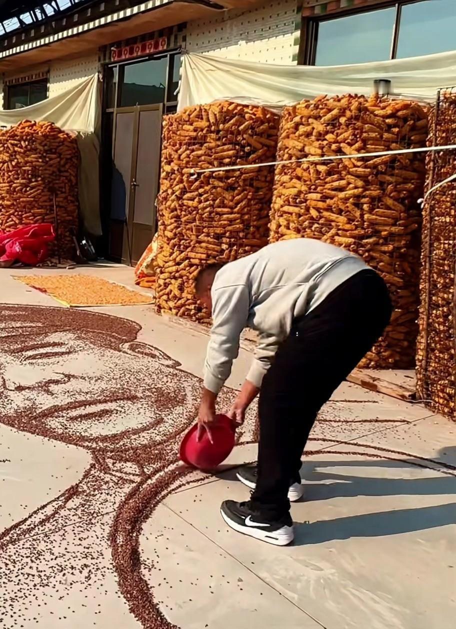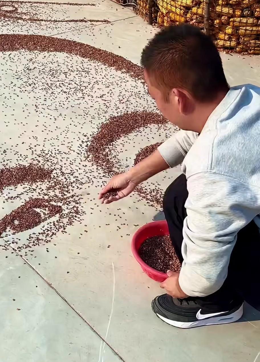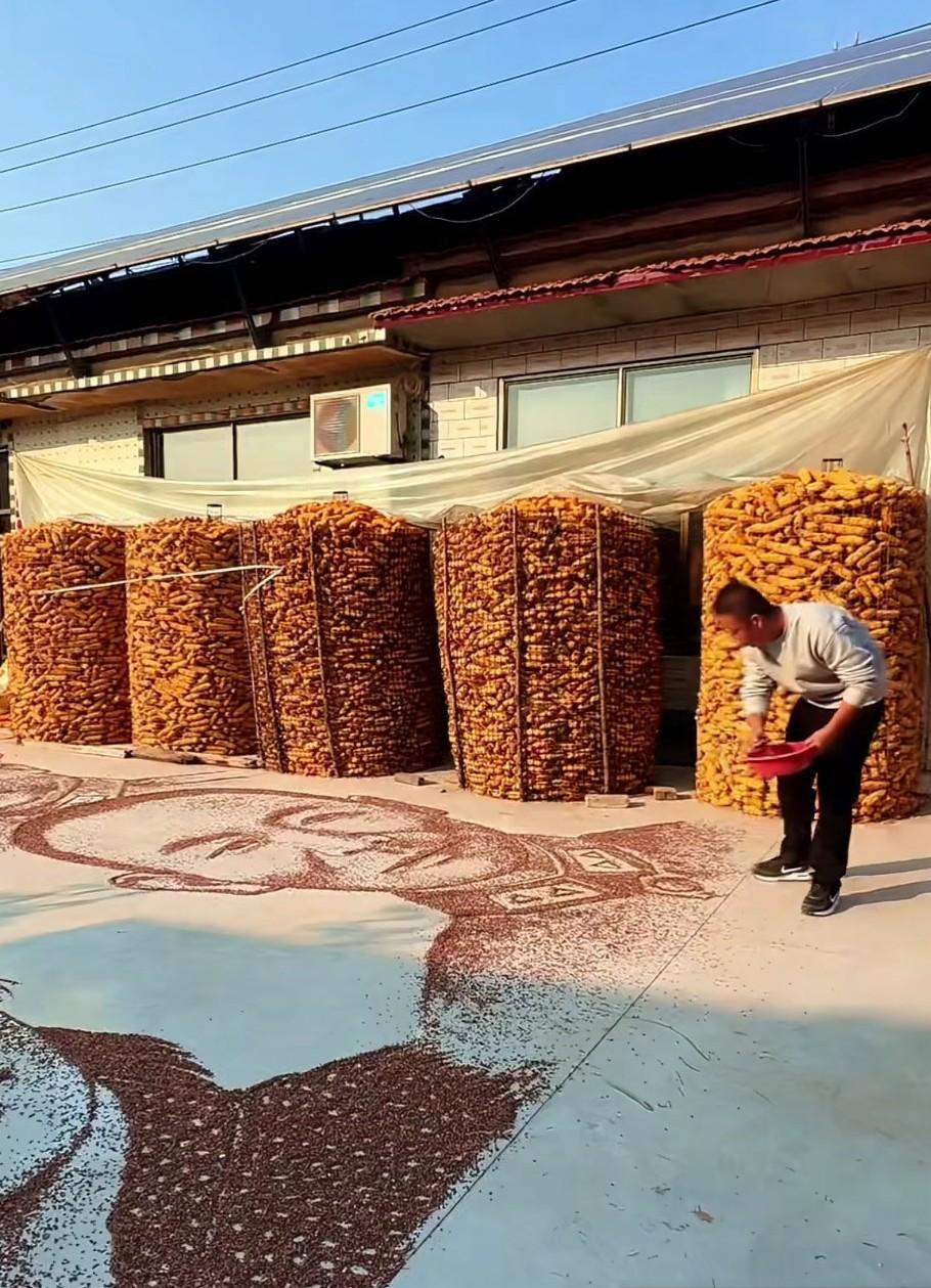 用谷物绘成的英雄组譜,是大地对烈士的敬仰! 山东滨州小伙赵同恺太牛了!他用黑小麦、玉米粒和玉米芯这些谷物,在家中庭院创作出电视剧《沉默的荣耀》中吴石、陈宝仓、朱枫、聂曦四位烈士的肖像。11月3日那天,他早上6点就开工,先用粉笔勾勒轮廓,再用约100斤自家收获的黑小麦“作画”,花了8小时完成长宽数米的巨幅作品。地面视角受限,他就把手机绑在4米高竹竿上检查修改。作品里烈士神态栩栩如生,获超75万网友点赞。谷物本是人类驯化万年的主角,他却用谷物绘出英雄组谱,致敬英雄,太令人敬佩!