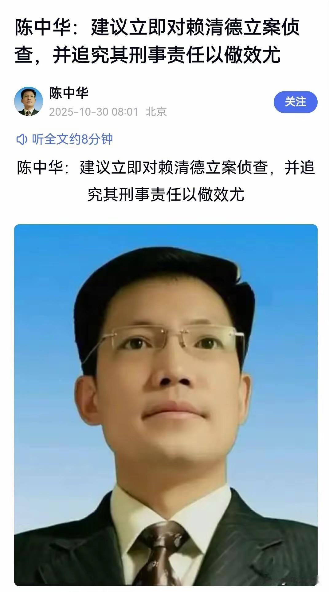 大陆律师建议立案侦查赖清德! 日前,继重庆警方立案侦查“台独“顽固分子沈伯洋之后,又有大陆律师建议,立案侦查“台独”首恶分子赖清德。 提出这项建议的是北京中公法律咨询中心主任陈中华,他给出的建议依据包括台湾是中国领土的历史经纬与法理基础不容置疑;赖清德“台独”分裂行径事实确凿,自我供认不讳;立案侦查具有明确的法律依据;立案侦查是维护法治与和平的必要举措等四个方面。 事实上,在大陆陆续公布将要依法追责的“台独”顽固分子名单后,蔡英文、赖清德一直没有在列,就有许多国人对此不理解,认为作为首恶分子,更应名列前茅,重点查办。 大陆有关部门之所以这么做,一定有自己的考量,这是国家层面的统筹考虑。但有一点是肯定的,不列入不意味着不侦查、不追责,挖树先断根,党羽喽啰都立案通缉了,首恶会跑得掉吗? 相信吧,台湾解放之日,就是赖清德被法办之时。