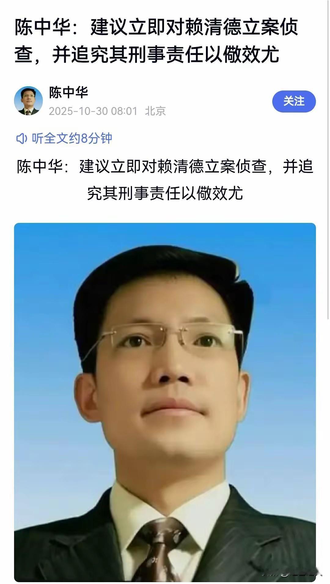 网民建议立案侦查赖清德! 日前,继重庆警方立案侦查“台独“顽固分子沈伯洋之后,又有大陆律师建议,立案侦查“台独”首恶分子赖清德。 提出这项建议的是北京中公法律咨询中心主任陈中华,他给出的建议依据包括台湾是中国领土的历史经纬与法理基础不容置疑;赖清德“台独”分裂行径事实确凿,自我供认不讳;立案侦查具有明确的法律依据;立案侦查是维护法治与和平的必要举措等四个方面。 事实上,在大陆陆续公布将要依法追责的“台独”顽固分子名单后,蔡英文、赖清德一直没有在列,就有许多国人对此不理解,认为作为首恶分子,更应名列前茅,重点查办。 大陆有关部门之所以这么做,一定有自己的考量,这是国家层面的统筹考虑。但有一点是肯定的,不列入不意味着不侦查、不追责,挖树先断根,党羽喽啰都立案通缉了,首恶会跑得掉吗? 相信吧,台湾解放之日,就是赖清德被法办之时。