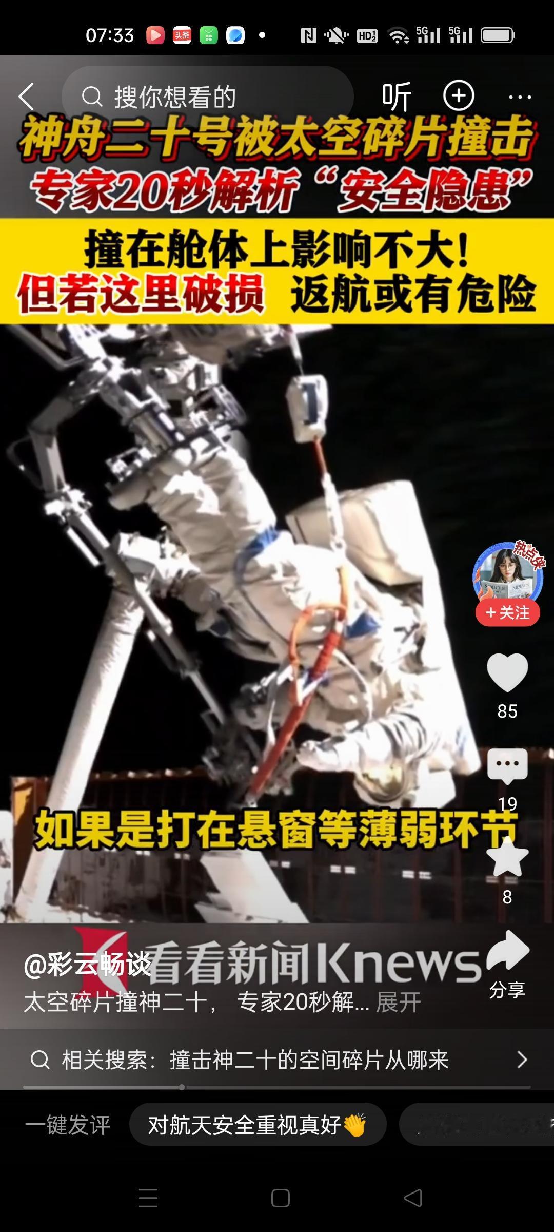 美国人听说我们的神20乘组返回推迟了,因为受太空碎片的撞击,肯定是在偷笑。 美国应该是太空垃圾最大的制造者,马斯克为了建造完整星链,就发射了很多卫星。 太空中的安全提到了首位,还好我们有备用方案,实在不行,神22再7天内就可以发射,去接我们的宇航员回来!