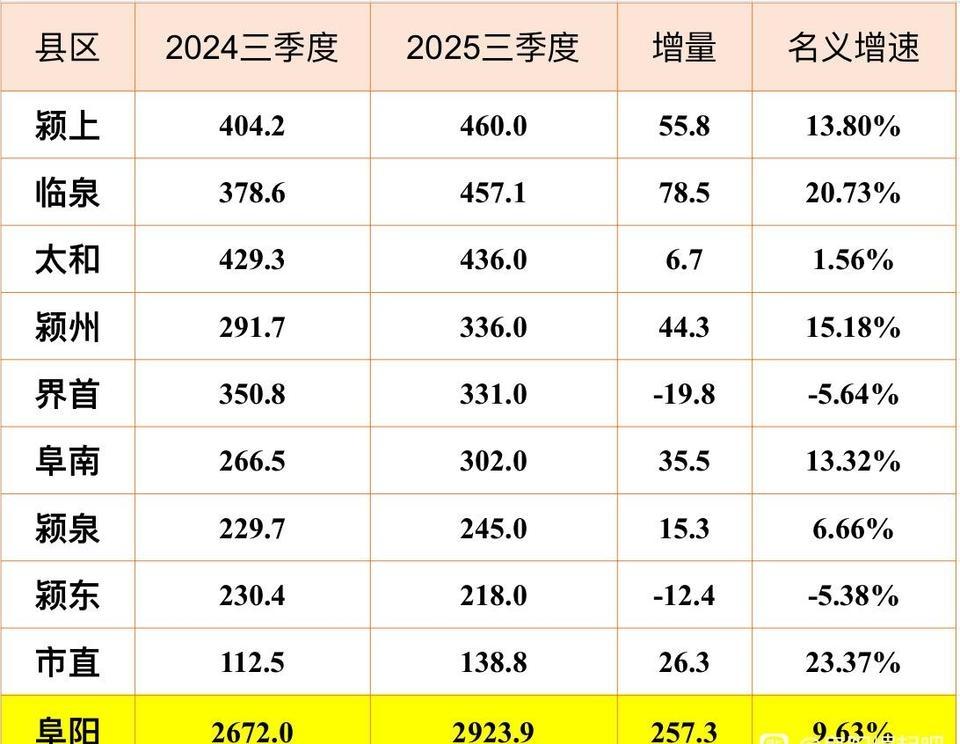 阜阳各区县前三季度GDP全部出炉:界首颍东负增长、太和被颍上和临泉双超 阜阳是安徽省经济第四强城市,今年前三季度GDP实现2923.6亿,较去年同期增加了257.3亿,名义增长9.63%,阜阳经济增量在省内仅次于合肥,位居全省第二名,截止目前,阜阳各区县前三季度GDP数据都已经出炉了,其中界首和颍东区较去年同期为负增长,同比下降19.8%和12.4%。 作为阜阳市经济老大哥的太和,今年前三季度GDP实现436亿,较去年同期仅增加了6.7亿,名义增长1.56%,而颍上和临泉分别实现460亿和457.1亿,较去年同期分别增加了55.8亿和78.5亿,名义增长13.8%和20.73%,太和经济增量与增速都低于颍上和临泉,导致经济总量被颍上和临泉双双反超。 颍泉区和颍东区分别实现245亿和218亿,较去年同期分别增加了15.3亿和-12.4亿,颍泉区经济增量高于颍东区,经济总量也是成功反超颍东区27亿。
