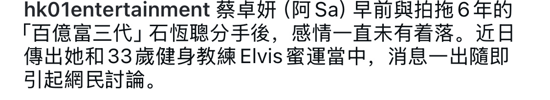 港媒爆蔡卓妍新恋情,阿sa新男友身份是健身教练,比阿sa小9岁。