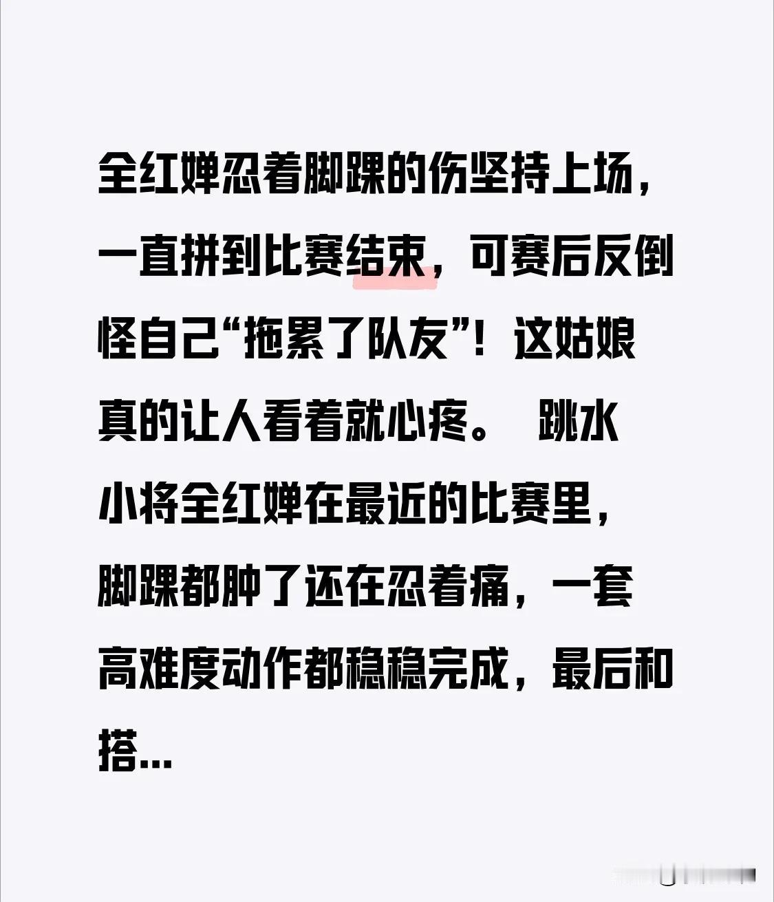 全红婵忍着脚踝的伤坚持上场,一直拼到比赛结束,可赛后反倒怪自己“拖累了队友”!这姑娘真的让人看着就心疼。 跳水小将全红婵在最近的比赛里,脚踝都肿了还在忍着痛,一套高难度动作都稳稳完成,最后和搭档一起拿到了银牌。赛后接受采访时,她眼眶都红了,声音带着点哽咽说:“刚才那个动作没跳好,连累了搭档,都怪我自己不够拼。”视频里能看到,她走路的时候脚踝使不上劲,一瘸一拐的,硬是咬着牙把所有赛程都走完了。 网友看完都在评论区里忍不住哭了:“她才17岁啊”“伤成这样还在检讨自己,这也太懂事了”“这就是我们中国运动员的拼劲儿啊”。后来教练才说,她赛前好几天就打了封闭针,上场前还在池边反复练跳水的入水姿势。评论区里都炸开了锅:“就算是银牌,也是我们的大英雄啊”“妹妹别哭,我们永远都支持你”。 看着小姑娘咬着嘴唇,眼泪在眼眶里打转,硬是没掉下来的样子,突然想起她之前说过:“每次站上跳板,就想对得起所有期待。”这样努力又懂事的小姑娘,谁能不佩服啊!下次我们还要看你在赛场上闪闪发光! 全红婵 全红婵勇夺冠 跳水冠军婵 全红婵世锦赛 全红婵写真 全红婵传奇人生 全红婵走秀