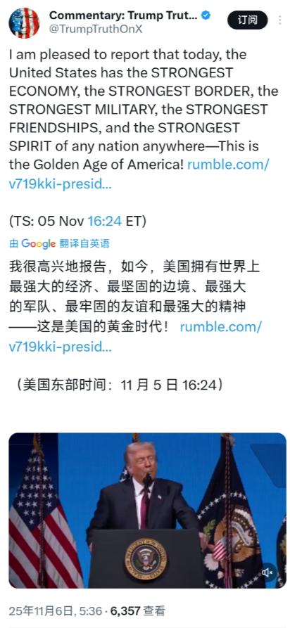 特朗普(北京时间11月6日)表示:“我很高兴地报告,如今,美国拥有世界上最强大的经济、最坚固的边境、最强大的军队、最牢固的友谊和最强大的精神 -这是美国的黄金时代!” 特朗普说这话的时候,听着倒是挺有气势,可真要跟眼下的实际情况对一对,就会里头掺的水分太多了。 他嘴里的 “黄金时代”,说白了就是裹着层漂亮包装的空壳子,稍微戳一下,里头的问题就露出来了。 咱先说说 “世界上最强大的经济” 这话。单看表面数据,二季度 GDP 增速被调到了 3.8%,这数儿瞅着确实不错,可经济体的内里早就跟 “空转” 没啥两样了。 这增长多半是靠企业砸钱搞人工智能投资撑起来的,像制造业、农业这些实打实创造民生价值的行业,到现在都没缓过劲来。 更能说明问题的是 “国内购买者最终销售额”—— 这指标是看真实需求的,增速才 1.2%,老百姓压根没多少花钱的意愿。 更让人头疼的是债务这事儿 —— 到 10 月底的时候,联邦政府的债务已经突破 37.9 万亿美元了。 光利息支出,去年就超了 1 万亿美元,比军费都多。连桥水基金的达利欧都警告,说再这么下去,美国经济早晚得 “犯心脏病”。 还有就业,9 月份私营部门一下少了 3.2 万个岗位,这是两年多来跌得最狠的一次,现在 22 个州都已经踩进衰退的边儿了,你说这样的经济,哪儿能算 “最强大”? 再看他说的 “最坚固的边境”。之前特朗普在联合国大会上演讲,还急着说别的国家 “搞开放边境就是瞎胡闹”,可美国自己的边境问题,压根就没解决明白。 他总说自己 “打击非法移民很在行”,但实际情况是,边境管控的漏洞一直没补上,不然也不会天天把 “控边境” 挂在嘴边当口头禅。 更关键的是,为了修边境墙,他之前还绕开国会,拿《国家紧急法》当由头,硬是挪用资金垫着修墙 —— 连立法机构的权力都想绕过去,这哪儿是边境 “坚固”,分明是在给制度挖漏洞。 至于说 “最强大的军队”,美国军费开支确实高,可架不住盟友不买账啊。他逼着西班牙把军费涨到 GDP 的 5%,要是达不到,就放话要把西班牙踢出北约。 可懂行的都知道,北约根本就没有驱逐成员国的机制,这话放出来不仅没吓到人,反而让欧洲盟友更反感。 西班牙首相直接顶了回去,说不可能为了顺着美国的意思,就不管本国老百姓的生活。欧盟也跟着放话,说要是美国敢搞关税威胁,肯定会坚决反击。 军队再强,要是盟友的心散了,连北约内部都快闹分裂了,这 “强大” 不也打了折扣?更别说现在债务利息都超过军费了,以后装备更新、军力部署能不能跟上,都是个大问号。 要说这 “最牢固的友谊”,那更是站不住脚。先不说北约内部因为军费的事儿闹得鸡飞狗跳,特朗普在联大上那通发言,就把不少盟友都给得罪了。 他嘲笑联合国大楼破旧,还质疑这个组织的宗旨,又逼着欧洲盟友跟着美国对俄罗斯加关税,可欧洲压根不买他的账。 法国直接宣布承认巴勒斯坦国,明摆着跟美国对着干 —— 要知道现在全球超 80% 的国家都承认巴勒斯坦国,就美国还在硬扛。 更别提他动不动就威胁给盟友加关税,西班牙这事儿刚闹完,欧盟已经明确说了要 “有力回应”,你说这样的关系,怎么看都跟 “牢固” 不沾边。 最后再说说 “最强大的精神”。就在他说这话的前一天,全美国还有 700 万人走上街头游行,2700 多个城镇里都有抗议的人,标语直接写着 “不要国王”。 现在 17 个州联合起来告他,说他叫停太阳能计划是违法的,两党更是斗得你死我活。 还有政府停摆这事儿,让 130 万军人的薪水可能发不及时,机场安检员穿着制服上班,下班了还得靠食品银行领吃的过日子,连海军官网都挂着教军人怎么申请失业救济的链接。 他还公开把反对自己的选民骂成 “寄生虫”,把负责多元包容的办公室也给解散了 —— 整个社会撕裂到这份上,哪儿有半点 “强大精神” 的影子? 特朗普口中的 “黄金时代”,说白了就是故意忽略那些麻烦事,自个儿跟自个儿说好听的。 经济空转、边境没个准儿、盟友离心离德、社会撕得稀碎,这些都是明摆着的问题,可不是靠一句口号就能盖过去的。