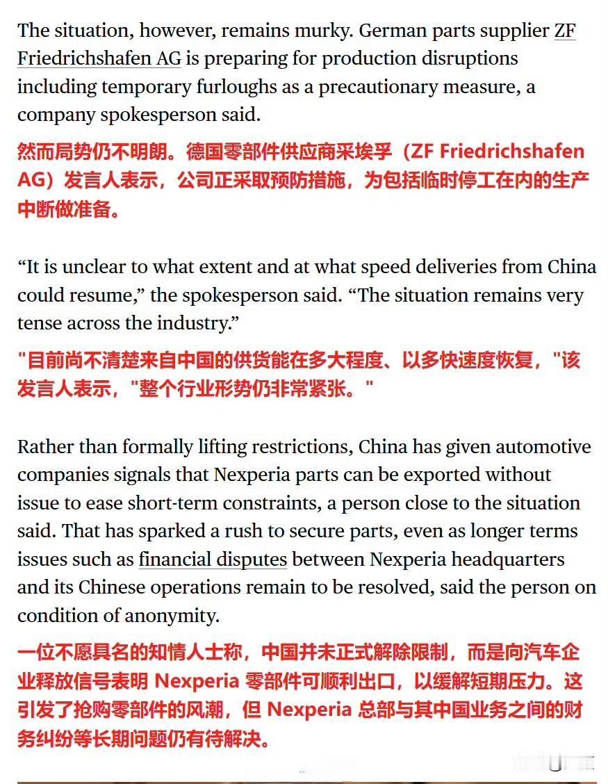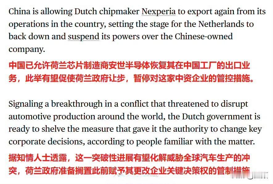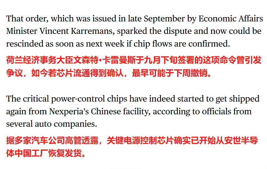 安世事件出现重要反转……据彭博社11月7日援引知情人士报道,荷兰政府准备暂停夺取安世半导体的控制权,但前提是中国恢复关键芯片出口。 知情人士透露,如果中国同意恢复出口关键芯片,荷兰政府将准备搁置此前授予其阻止或更改安世重大企业决策权的部长令。若芯片供应恢复并在未来几天内得到核实,荷兰方面最早可能在下周撤销相关权力,但同时,安世(荷兰)与安世(中国)之间的财务问题也必须得到解决。 荷兰经济事务大臣文森特·卡雷曼斯当地时间11月6日晚发声明表示,荷兰已收到中美两国的通知,双方上周达成的经贸协议将使安世半导体中国工厂恢复出货。他还称,“鉴于我们与中国进行的建设性对话,荷兰相信,来自中国的芯片将在未来几天内重新供应至欧洲及世界各地的安世客户手中”。 德国经济部发言人Luisa - Maria Spoo对荷兰与中国在这一问题上实现局势降级并持续开展谈判表示非常欢迎,称德国正与荷兰及相关受影响企业保持沟通。德国汽车工业协会曾警告,若僵局持续,2025年欧洲汽车产量或减少120万辆,可见安世半导体芯片供应问题对德国汽车产业影响巨大。