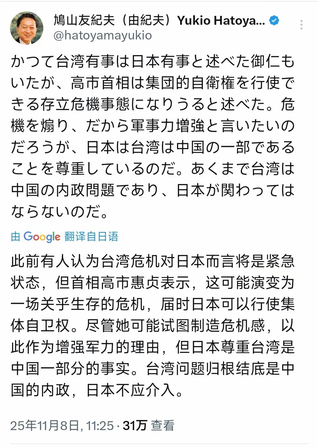 日本政坛上演了一出“红白脸”大戏。主角是前首相鸠山由纪夫和现任高官高市早苗,舞台是敏感的台湾问题,剧本则关乎日本的未来走向。 高市早苗先抛出了一颗震撼弹。她在国会质询中,把“台湾有事”直接等同于“日本有事”,甚至上升到“生存危机”的高度,声称届时可以行使集体自卫权。这番话,火药味浓得能呛死人。她就像一个急于点火的鼓动者,试图用最极端的言辞,为日本军力扩张寻找一个“师出有名”的理由。这已经不是简单的擦边球,而是直接踩在了中国的红线上。 就在这紧张气氛快要凝固的时候,鸠山由纪夫站了出来,像一盆冷水浇了上去。他发文直指高市的言论,点明其本质:制造危机感。鸠山的话简单直接,却字字千钧——“日本尊重台湾是中国一部分的事实”,“台湾问题归根结底是中国的内政,日本不应介入”。这番表态,在当下日本政坛,简直像一股清流,虽然微弱,却异常清醒。 这出“红白脸”的背后,是日本社会两种截然不同的生存哲学在激烈碰撞。高市早苗代表的是一种“赌徒心态”,她认为把日本绑上美国的战车,在台海问题上冒险一搏,就能让国家“正常化”,摆脱战后束缚。这种想法,就像一个输红眼的赌徒,准备把最后的筹码全押上,却没想过万一输掉的后果。 而鸠山由纪夫守护的,则是一种“邻居家着火”的朴素智慧。他深知日本的地缘处境,台湾离日本太近了,近到一旦战火燃起,日本根本无法独善其身。他看得很明白,跟着美国瞎起哄,最终只会引火烧身,把日本变成战场。他的警告,是在提醒那些被冲昏头脑的同僚:别玩火,玩火者必自焚。 可惜的是,在日本政坛,鸠山这样的理性声音越来越像濒危物种。更多政客被短视的利益和狭隘的民族主义裹挟,把台湾问题当成捞取政治资本的工具。他们口口声声为了“国家利益”,实际上却是在把日本推向一个极其危险的深渊。 这场争论,已经超越了简单的政客口舌之争。它关乎日本的国家定位,关乎东亚的和平未来。高市早苗们在玩一场危险的游戏,她们以为自己在下一盘大棋,实际上可能只是在为自己的政治前途铺路,而代价,可能是整个国家的安危。鸠山由纪夫的发声,或许无法阻止这列失控的列车,但至少,他为历史留下了一份清醒的记录。