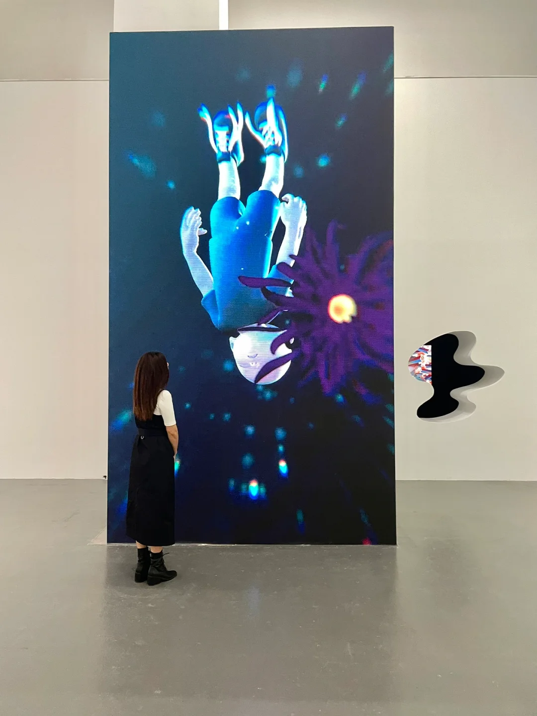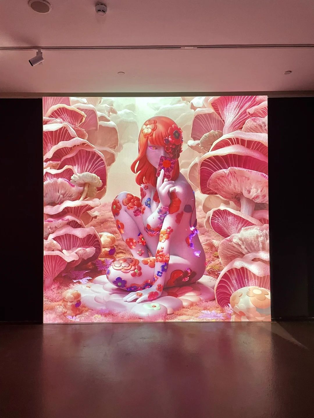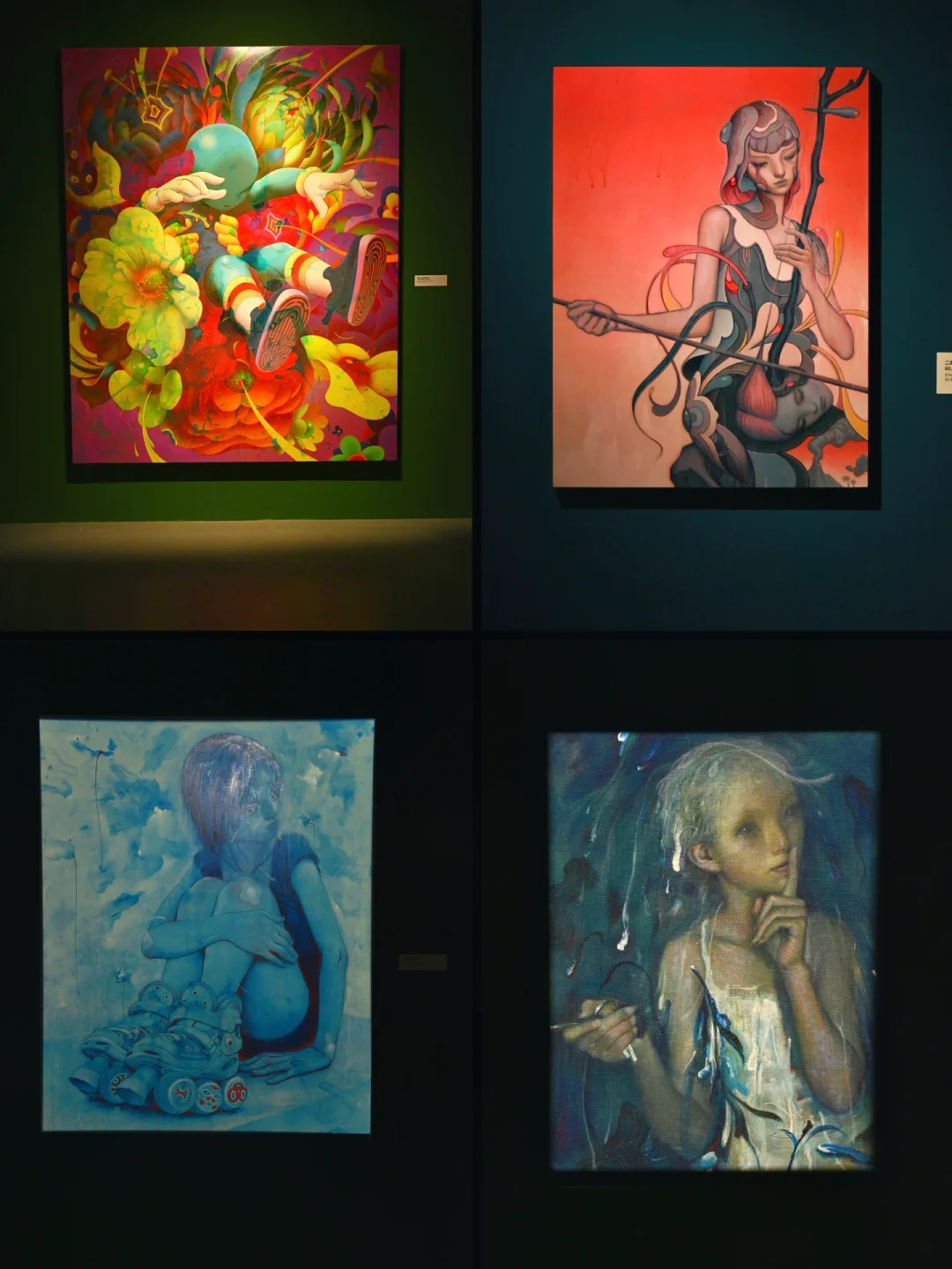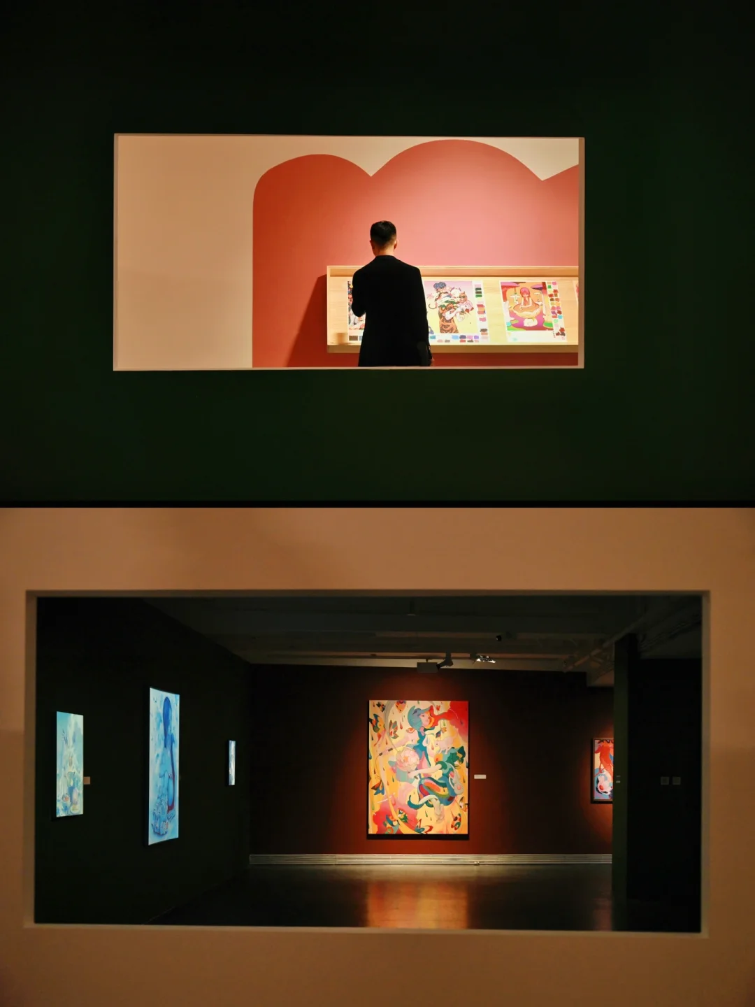 一进入展厅,就是简明2023年最新创作《太阳塔罗牌》以及经典作品“衍生”系列的新作品,展厅里有5件动画多媒体装置,屏幕📺前面都放置了动画的人物的雕塑,林俊杰的新专辑封面💿也在这个单元里面,再往里面还有两件长达9米的巨幅绘画作品《衍生》和《狂奔》。
