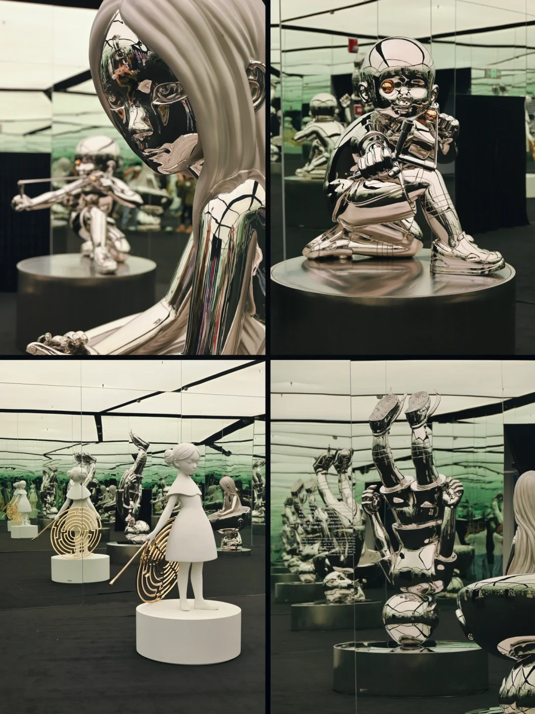 逛完二楼展厅艺术玻璃的时候,一定要从左边出去上三楼,三楼还有个“万神殿”,里面五个大型不锈钢雕塑🗿,虽然只有五个,但是由于多面玻璃墙面来装饰,通过玻璃折射处呈现很多个雕像,创造出一片想象的海洋。雕塑都是来自简明作品的人物,比如“坠落男孩”“面条女孩”等等,可以看看面条女孩,上半部分是女孩的头部,中部恰似一碗面条,下部分又是一个孩子的身体,另外还有一个男孩的雕塑,用眼球作为弹弓的子弹,也是利用了中国古话“以眼还眼”的典故。👍