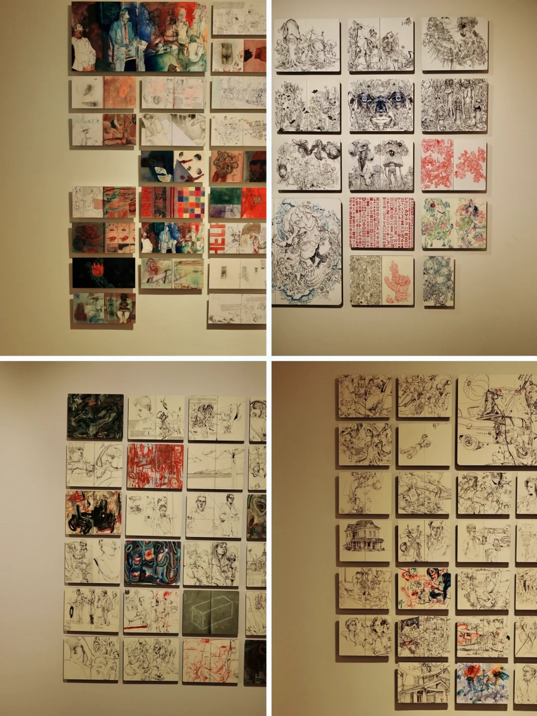 上二楼首先可以看到超过100幅简明从1999开始记录下的速写手稿📜,里面还复刻了简明的工作室场景。之后会看到超过30张简明的丙烯画作品。里面有很多中国的元素,比如:太湖石、鹿🦌等等,我发现简明特别喜欢包菜,很多画都有包菜的元素,后面看他的短片发现他特别喜欢吃包菜,也是证明了这一点。
