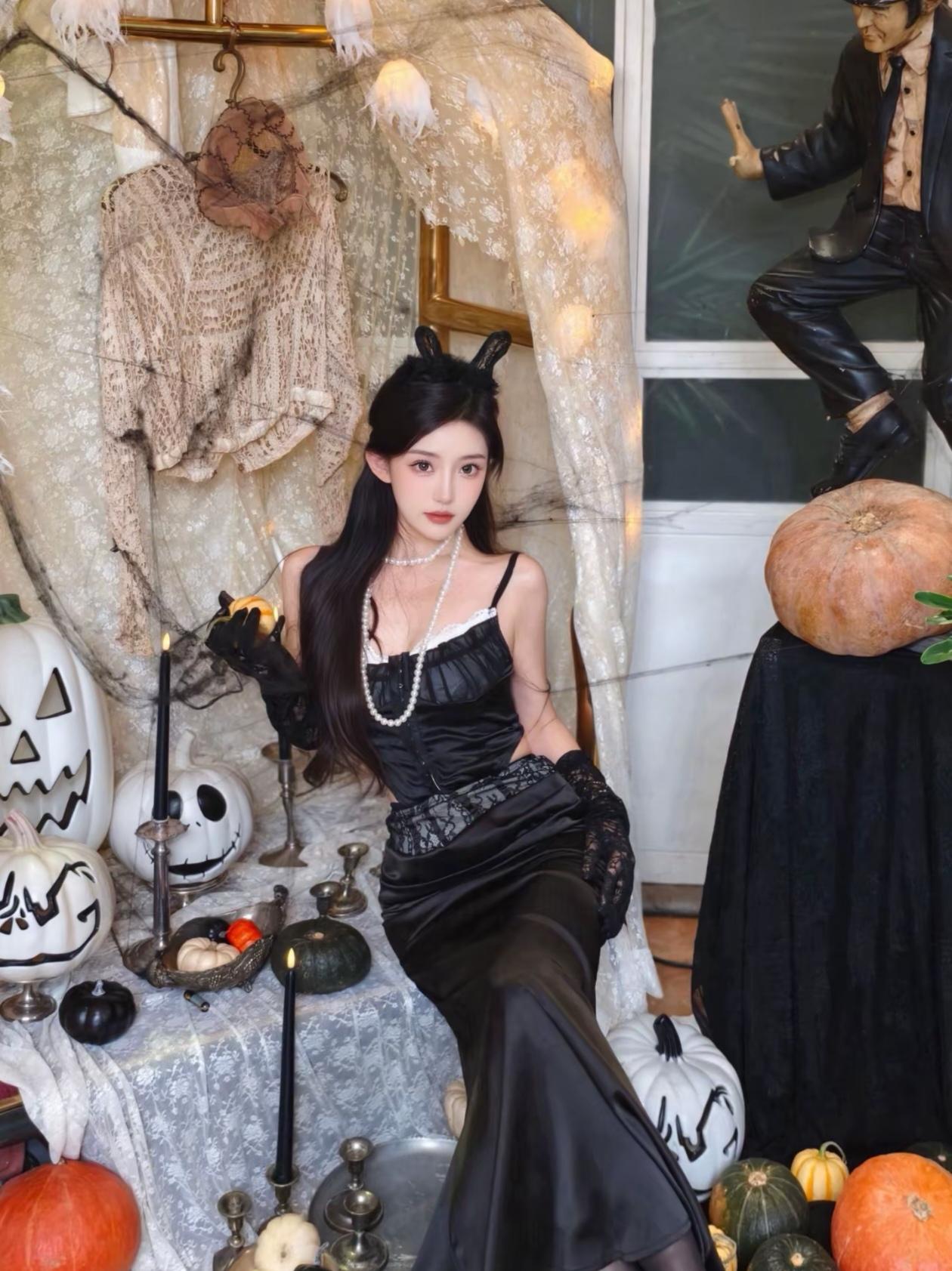万圣节氛围浓厚的居家装饰,甜美少女与南瓜灯的完美搭配。