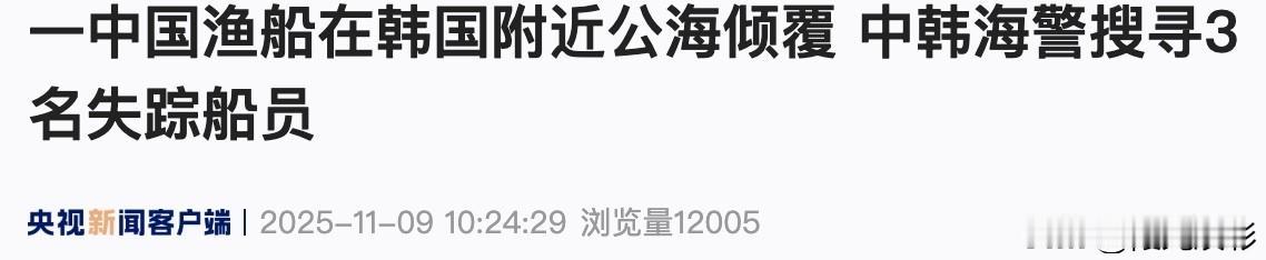 突发:一艘中国渔船在韩国附近公海倾覆 一艘载有11名船员的中国渔船于首尔时间11月9日6时50分左右在距离韩国全罗南道新安郡约81公里的公海上倾覆,随后到达现场的韩国海警和附近渔船一起救起8名船员。目前韩国海警与中国海警正在继续搜寻其余3名失踪船员。