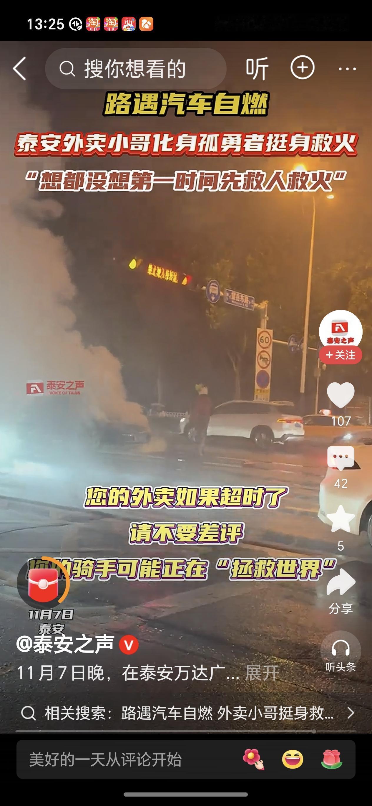 外卖小哥挺身救火近日山东泰安,一小汽车发生自燃,外卖小哥见状,不顾个人安危,提着两个灭火器,只身前去救火! 别人慌着后退,他却提着灭火器向前冲,外卖小哥用行动诠释勇敢不分职业,让人敬佩!为见义勇为者点赞[赞]