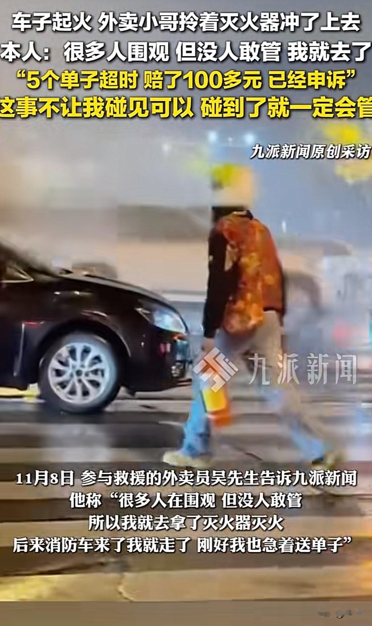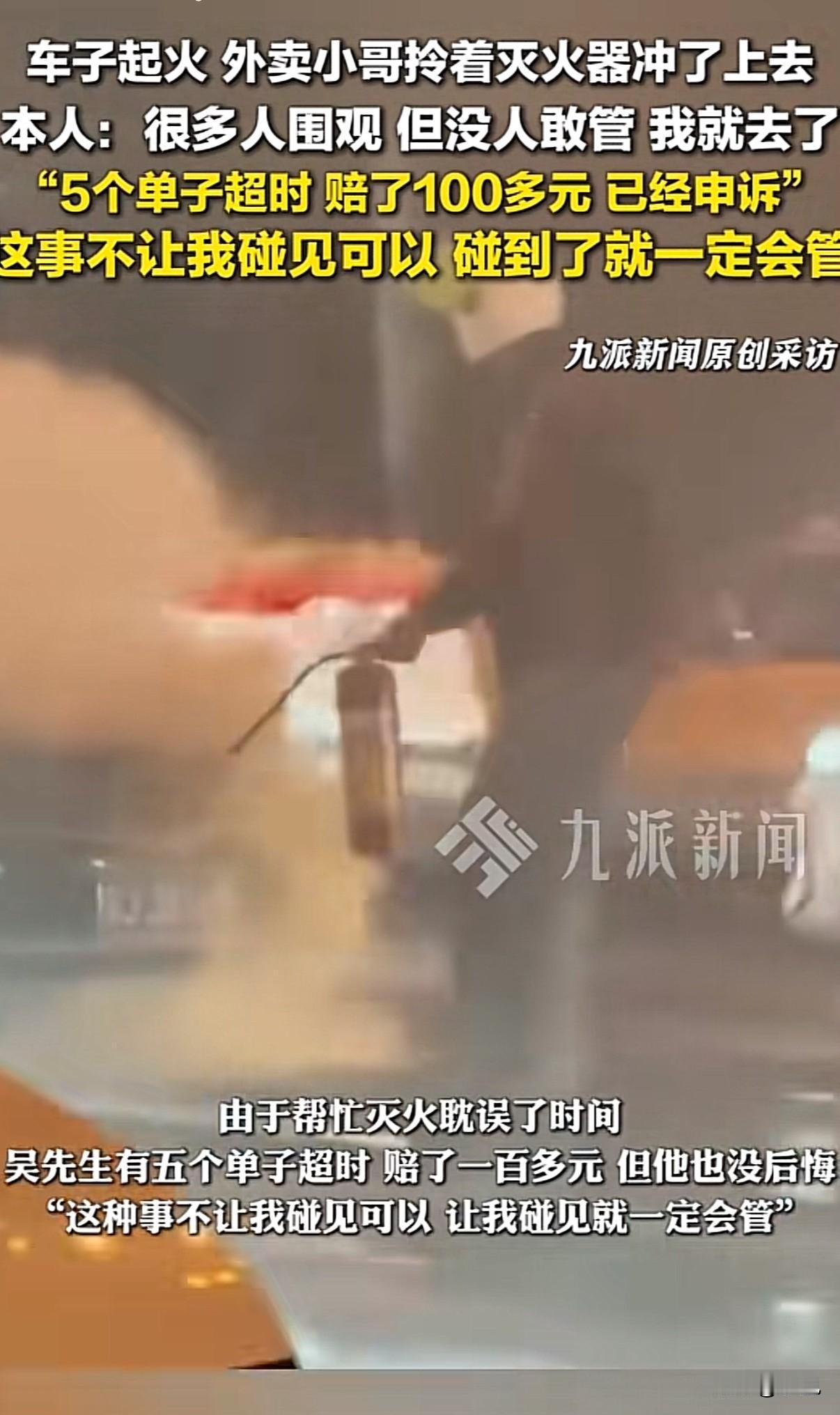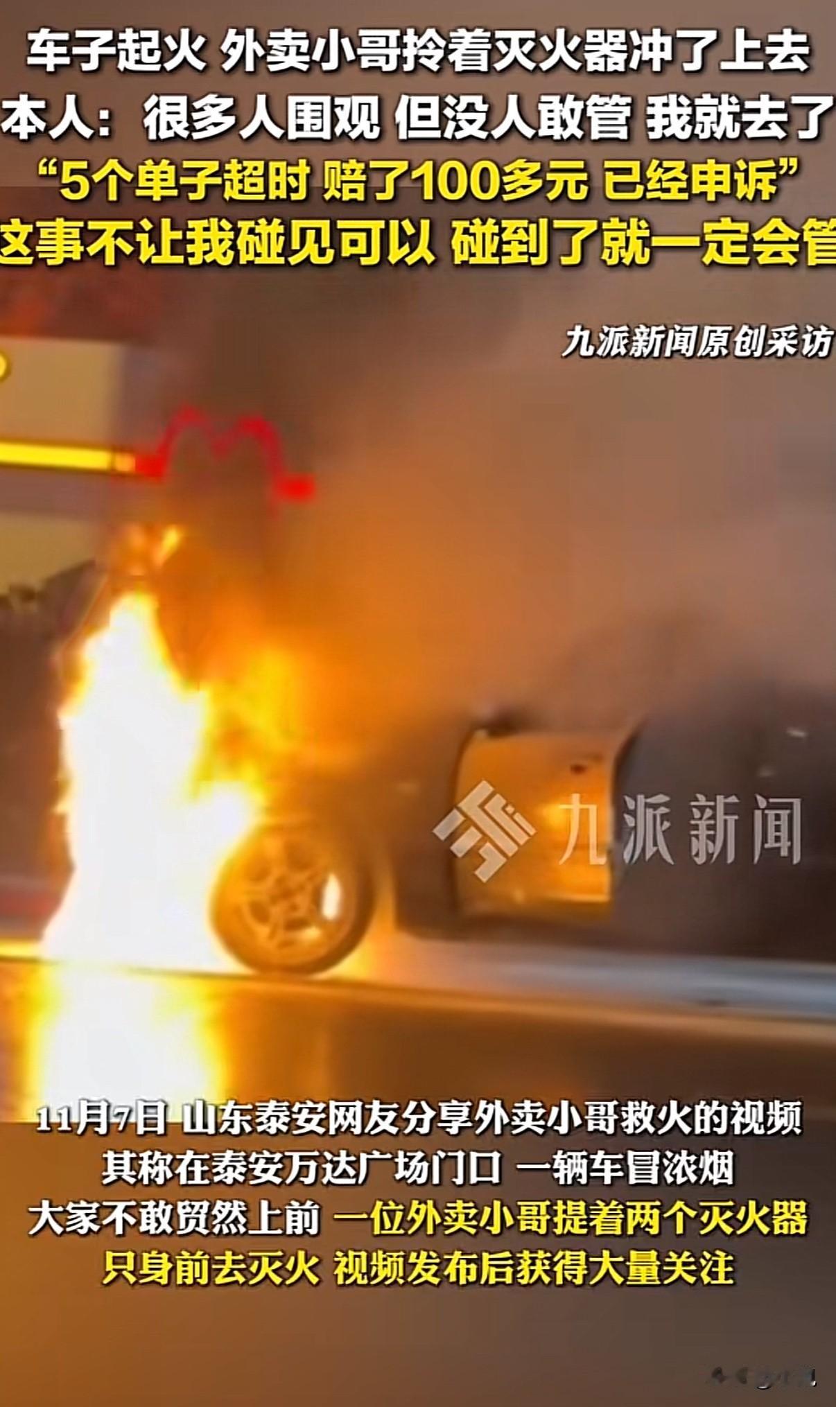这个外卖小哥的举动,值得点赞。 在泰安万达广场,他送餐途中看见一辆车冒着浓烟。周围人都在观望,他没犹豫,从警卫室拿了两个灭火器就上前把火扑灭了。 为此,他五个订单超时,被平台扣了一百多元。那俩灭火器,警卫室起初也是要他赔的。 但后续很暖心。 警卫得知他是用来救火,摆摆手说不用赔了。顾客们听说原因后,都表示理解。平台也收到了他的申诉,正在处理。 虽然赔了钱,但他一点也不后悔。他说了:“让我碰见就一定会管。” 这朴素的道理,这暖心的结果,让人看到了善意的循环。