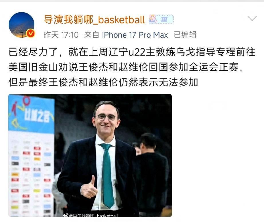 说一句掏心窝子的话!辽宁外教去美国游说王俊杰和赵维伦参加全运正赛未果,这是意料之中的事,拿钱办事,只能同甘不能共苦,毕竟不是辽宁自己家孩子,看到辽宁队目前人员不齐,难有所为,两位旅美球员选择留在NCAA继续征战,也是理所当然的,毕竟不是家乡子弟兵任续航,必须要感谢辽宁外教洛佩斯敬业精神,全运会让他带队是辽宁体育局对他信任,双向奔赴
