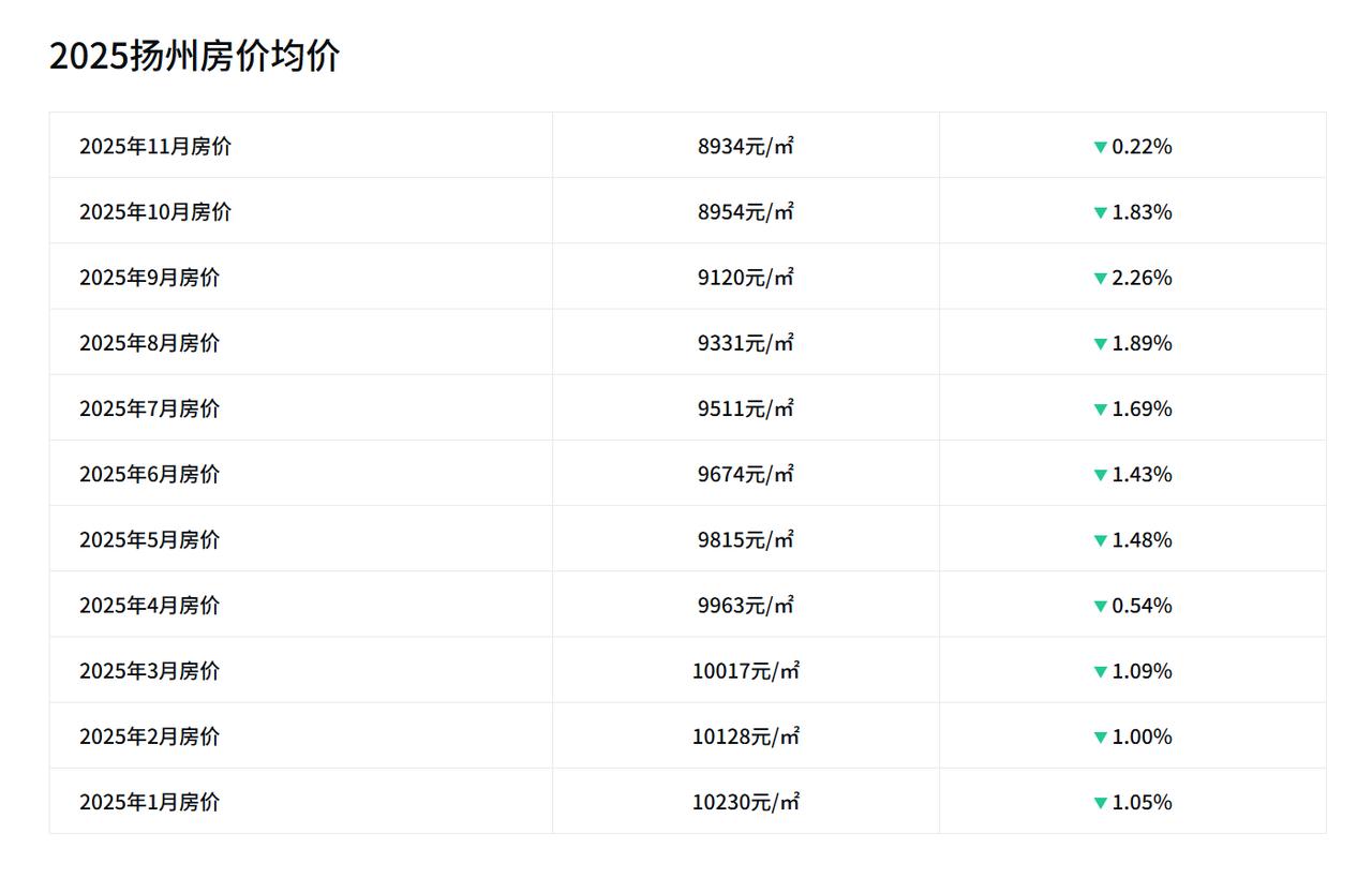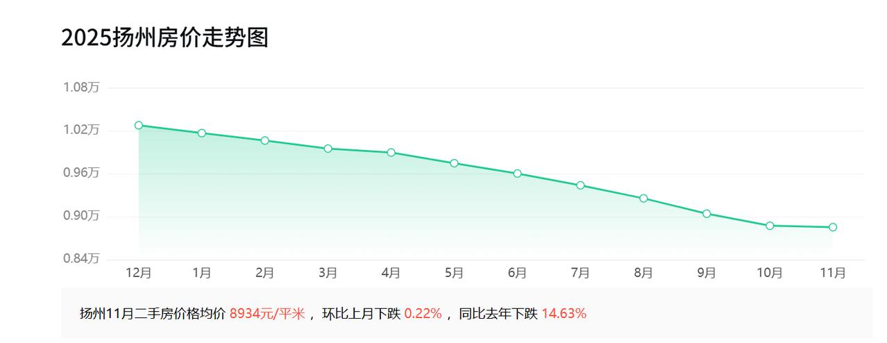 2015年10月,扬州房价均价10028元; 2016年10月,扬州房价均价8401元; 2017年10月,扬州房价均价10665元; 2018年10月,扬州房价均价12669元; 2019年10月,扬州房价均价13063元; 2020年10月,扬州房价均价13535元; 2021年10月,扬州房价均价14144元; 2022年10月,扬州房价均价13667元; 2023年10月,扬州房价均价12773元; 2024年10月,扬州房价均价10586元; 2025年10月,扬州房价均价8954元。   扬州过去十年的房价数据,是一条清晰的倒U型曲线,回望2015年,扬州房价还停留在10028元,那时的市场不温不火,没人能预料到接下来的狂飙突进。   2016年,房价意外地下探到8401元,成了扬州房价最后一个低点,从2017年开始,市场突然启动,房价如脱缰野马,从10665元一路涨到2018年的12669元、2019年的13063元。   2020年,疫情并没能阻止房价上涨,13535元的价格继续创下新高。2021年,扬州房价达到历史最高点14144元。对比2015年,涨幅41%,如果从2016年的低点计算,涨幅更是达到68%。   2022年开始,房价开始下降,2023年,房价跌至12773元,较2021年下跌了近10%。2024年,房价加速下跌至10586元,一年内跌幅超过17%。2025年10月,房价已降至8954元,比2015年的价格还要低10%以上,回到了比七年前更低的水平。   扬州房价的持续下跌,是多种因素共同作用的结果,扬州作为三线城市,人口流向的变化也是重要因素。随着大城市吸引力不断增强,三四线城市人口增长放缓,甚至出现外流,直接影响了住房需求。