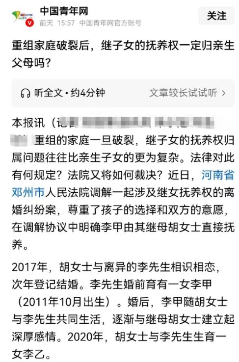 河南邓州,胡女士和二婚带娃的李先生再婚,婚后没几年,两人感情破裂离婚,可李先生的女儿却不愿意跟亲生父亲,反而要求跟着胡女士这个继母一起生活,那么,法院会怎么判呢?   庭审现场,14岁的小李攥着继母胡女士的手不肯松开,眼泪砸在法庭地板上,我只想跟胡妈妈过,这里有我熟悉的一切。   时间回到2017年,彼时李先生带着6岁的女儿小李独自生活,一次偶然的机会与胡女士相识。   没有“后妈难当”的狗血戏码,小李对胡女士的亲近来得格外自然,第一次见面就主动分享零食,放学路上总愿意牵着胡女士的手,连李先生都打趣“女儿比自己先爱上她”。   2018年两人登记结婚后,胡女士用行动践行着“母亲”的责任:小李挑食,她就变着花样做营养餐。   两年后,小女儿的出生,并未打破这份温情,胡女士特意留出专属时间陪伴小李,带她参加兴趣班、周末短途旅行,还教会她照顾妹妹。   小李也用自己的方式回应这份爱:她会攒下零花钱给胡女士买护手霜,会在胡女士疲惫时主动做家务,姐妹俩形影不离的模样,成了邻里口中的佳话。   小李的日记本里,贴满了和胡女士的合影,扉页上写着,胡妈妈给了我完整的家。   转折发生在2021年,生活琐事的累积、性格差异的凸显,让胡女士与李先生的感情出现裂痕。   胡女士第一次提出离婚,法院考虑到孩子的成长环境,判决不准离婚。   但此后的“半分居”生活,让家庭氛围愈发压抑:餐桌上的沉默、避免正面接触的尴尬,让两个孩子变得越来越内向。   为了给孩子一个“完整的家”,2024年初两人选择复婚,可矛盾并未化解,反而因教育理念、生活开支等问题愈演愈烈。    2024年底,胡女士再次起诉离婚,态度坚决,李先生同意离婚,却在抚养权问题上寸步不让,小李是我亲生女儿,血缘摆在这,她必须跟我走。   这番话让小李陷入极度恐慌,她偷偷给法官写了一封信,详细讲述了八年来胡女士对自己的照顾,字里行间满是依赖与不舍。   信中写道,爸爸很少陪我,家长会、生病住院,都是胡妈妈在身边,她知道我所有的小秘密,是我真正的妈妈。   这起案件的核心争议,在于继父母对继子女的抚养权是否具备法律依据。   很多人认为,“血浓于水”是不变的真理,继父母与继子女之间没有血缘纽带,离婚后自然无权争夺抚养权。   但司法实践中,这样的认知早已被打破,《民法典》第一千零七十二条明确规定,继父或继母和受其抚养教育的继子女间的权利义务关系,适用本法关于父母子女关系的规定。   这意味着,只要形成了稳定的抚养教育关系,继父母就拥有与亲生父母同等的权利与义务。    邓州法院的法官在审理过程中,不仅核实了胡女士八年的抚养事实,还走访了小李的学校、社区及邻里。   老师证实,胡女士是小李的“常客”,无论是家长会还是亲子活动,从未缺席;邻居反映,胡女士对两个女儿一视同仁,小李的衣食住行、教育开支均由其主要承担。   更重要的是,小李已年满14岁,具备独立判断能力,其坚决跟随胡女士生活的意愿真实且明确。    最终,经过多轮调解,双方达成一致协议:胡女士与李先生解除婚姻关系,小李与妹妹均由胡女士直接抚养,李先生每月支付抚养费,享有每月两次的探视权。   调解结束后,小李紧紧抱住胡女士,脸上露出了久违的笑容,胡女士说,我从未把她当继女,八年的相处早已让我们成为真正的一家人。   在现代社会,家庭结构日益多元,再婚家庭、收养家庭等形态不断涌现,血缘不再是定义亲情的唯一标准。   法律的本质是维护公平正义,而抚养权的归属,本质上是对“爱与责任”的认可。    当我们追问“什么是家人”,邓州法院的这起判决给出了最好的答案。   家人不是靠血缘强制绑定的关系,而是用日复一日的陪伴、真心实意的付出、不离不弃的责任搭建起来的港湾。