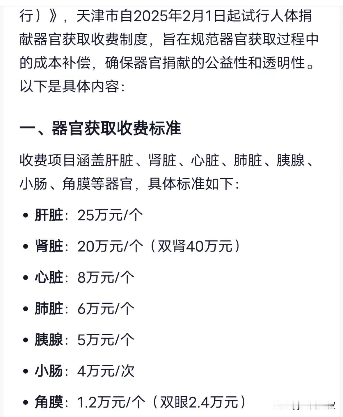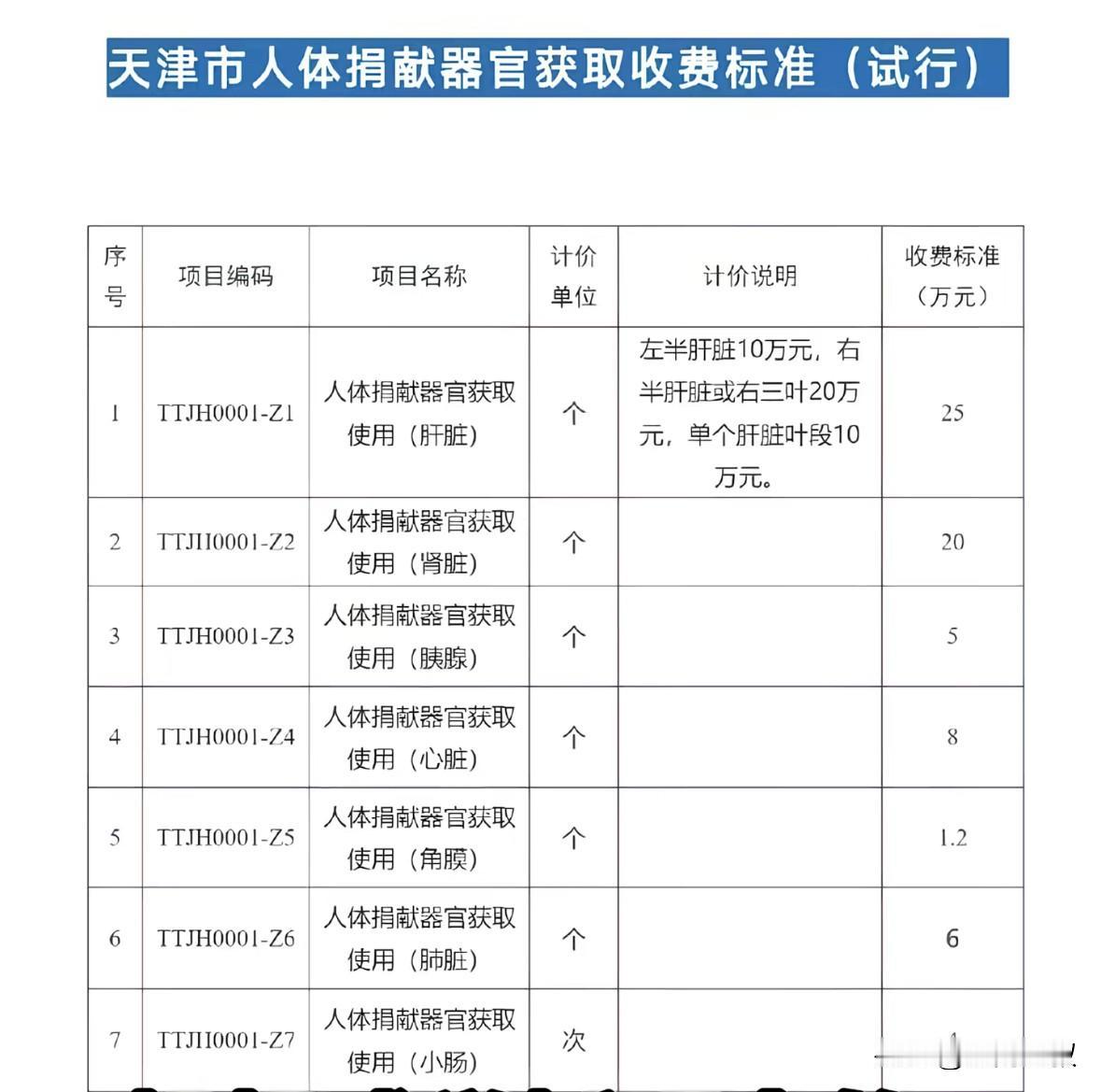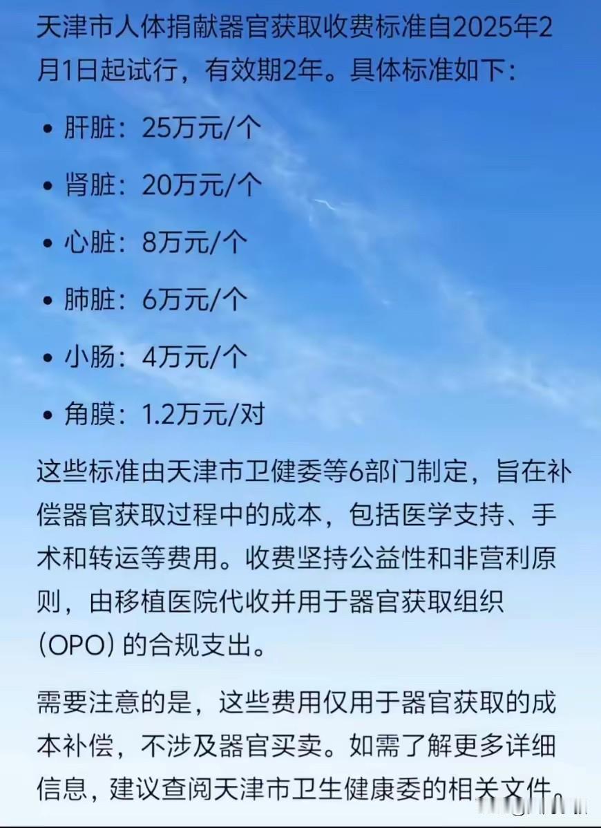 从2025年2月开始试行 天津人体捐献器官获取收费标准 这是官方制定的“手术及物流”成本价 肝脏25万1个 肾脏20万1个 心脏8万1个 肺脏6万1个 …… 这个标准,是为了让器官捐献移植这套救人的系统能持续、规范的运转。 最重要的一点,器官本身是无价的,全部来自爱心者的捐献。