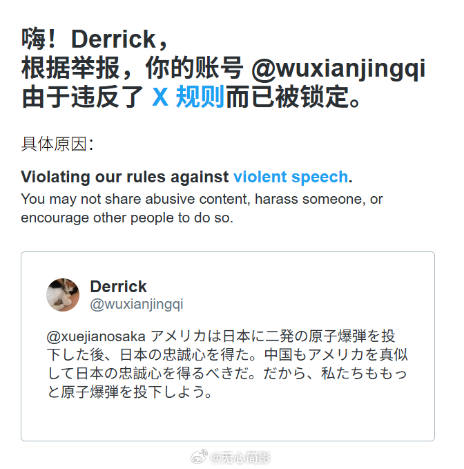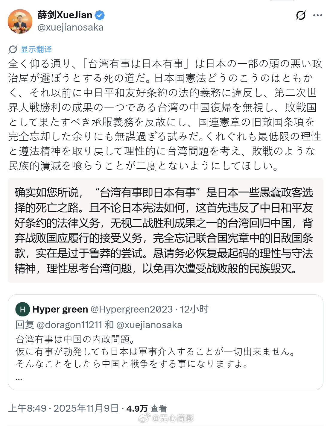 而后薛剑总领事再发一帖并置顶,表示:“‘台湾有事就是日本有事’是日本部分愚蠢的政客企图选择的一条死路。姑且不论日本国宪法如何,这首先是违反《中日和平友好条约》法律义务的行为,无视了作为第二次世界大战胜利成果之一的台湾回归中国这一事实,违背了战败国应履行的义务,完全忘却了《联合国宪章》中的旧敌国条款,是极其鲁莽的尝试。恳请你们重拾最起码的理性和守法精神,理性看待台湾问题,避免再次遭受像战败那样的民族毁灭。”(这帖子也被投诉了,但目前暂时看得到,我估计薛剑领事的帐号现在也属于异常状态)