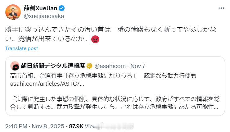 起因是,日本首相高市早苗声称“台湾有事”而可能动用武力后,薛剑总领事转发相关新闻,并写道“擅自伸过来的肮脏脑袋,只能毫不犹豫地砍掉。你做好觉悟了吗!”