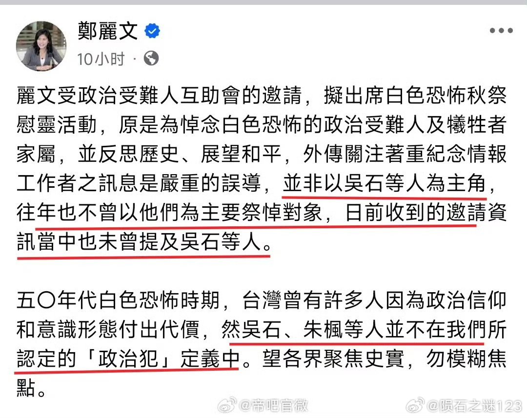 郑丽文自己都澄清了“不是以吴石等人为主角”,很多人都选择视而不见,偏偏要弄出这样一个话题,让所有人尴尬。