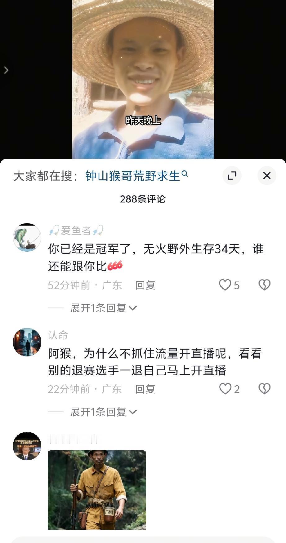 广西老表猴哥还是退赛了,他是真正的荒野求生达人,34天没有生火,吃的全是生的,看着他赛前和赛后的差距真的好大,莫名的让人心疼! 这几天湖南的天气冷了,他的家人非常担心他,并通过节目组对他进行劝导,担心他的身体撑不住。 他在直播的时候回应了为什么退赛,他说这几天天气太冷了,他的衣服很薄,特别是脚,脚太冷容易生病,他的身体估计也撑不了那么久,快到极限了。 看到别的视频,他还会给自己把脉,所以他是一个非常理智的人。 湖南比广西冷多了,看着他穿那么少,真的有点心疼,所以也理解他家人为什么劝他退赛。 退赛没关系,身体最重要,大家说对吧?用一张图片记录生活 荒野求生湖南 晒一晒你身边的风景