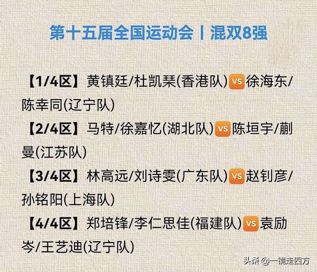 昨晚的第十五届全运会乒乓球混双1/8决赛最后两场争夺,福建的郑培锋/李仁思佳3-1力克江苏的曹彦涛/石洵瑶,辽宁的袁励岑/王艺迪3-2险胜湖北的薛飞/王晓楠,混双8强也全部产生。1/4决赛,上半区两场对决是头号种子黄镇廷/杜凯琹对阵徐海东/陈幸同,马特/徐嘉忆对阵陈垣宇/蒯曼,下半区是林高远/刘诗雯对阵赵钊彦/孙铭阳,郑培锋/李仁思佳对阵袁励岑/王艺迪。