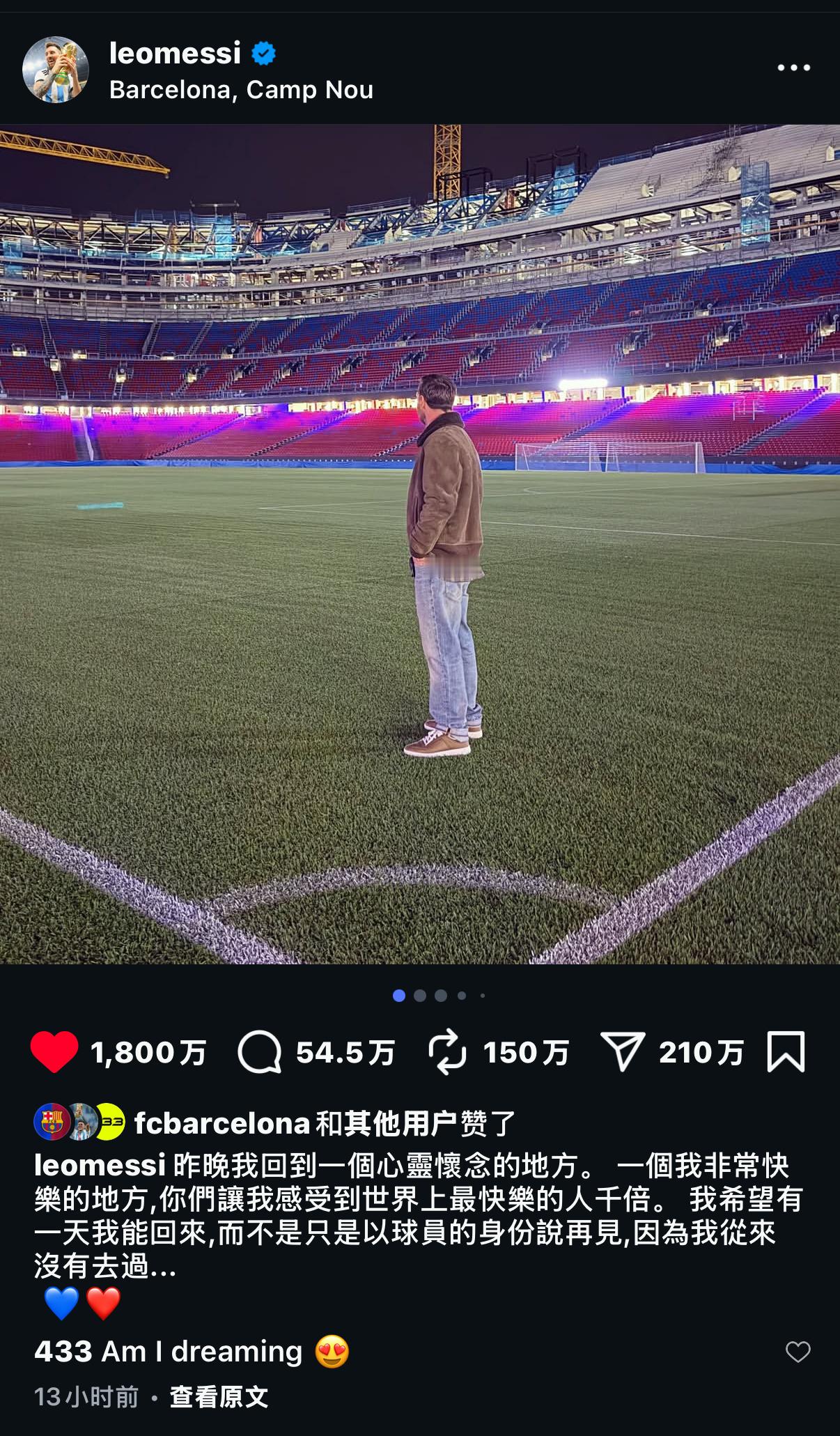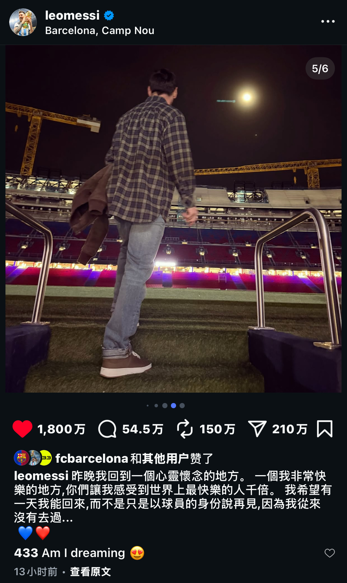 梅西路过回家,重返巴萨诺坎普球场。1800w点赞。