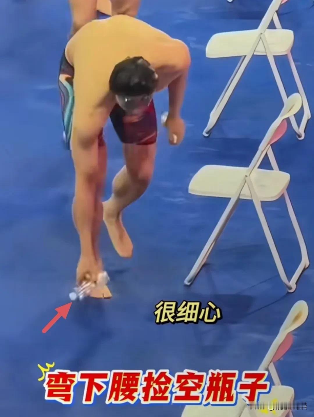有时候一个细小的动作,就能看出一个人的性情! 汪顺在第十五届全运会的游泳团体赛决赛完之后,与队友退场时,看到脚下的一个空矿泉水瓶子,就顺手捡了起来,带离了场地。 虽然只是一个小小的顺手动作,却足见他的细心。带走场地的垃圾,既可以保持场地干净,也可以防止队友不小心踩到而摔倒。 说实话,也就是这么一个小小的动作,让我们看到不一样的他。这么靓的仔,高大帅气,有八块腹肌,游泳这么厉害,心还那么细,真的让人好喜欢啊,谁嫁给他有福了!